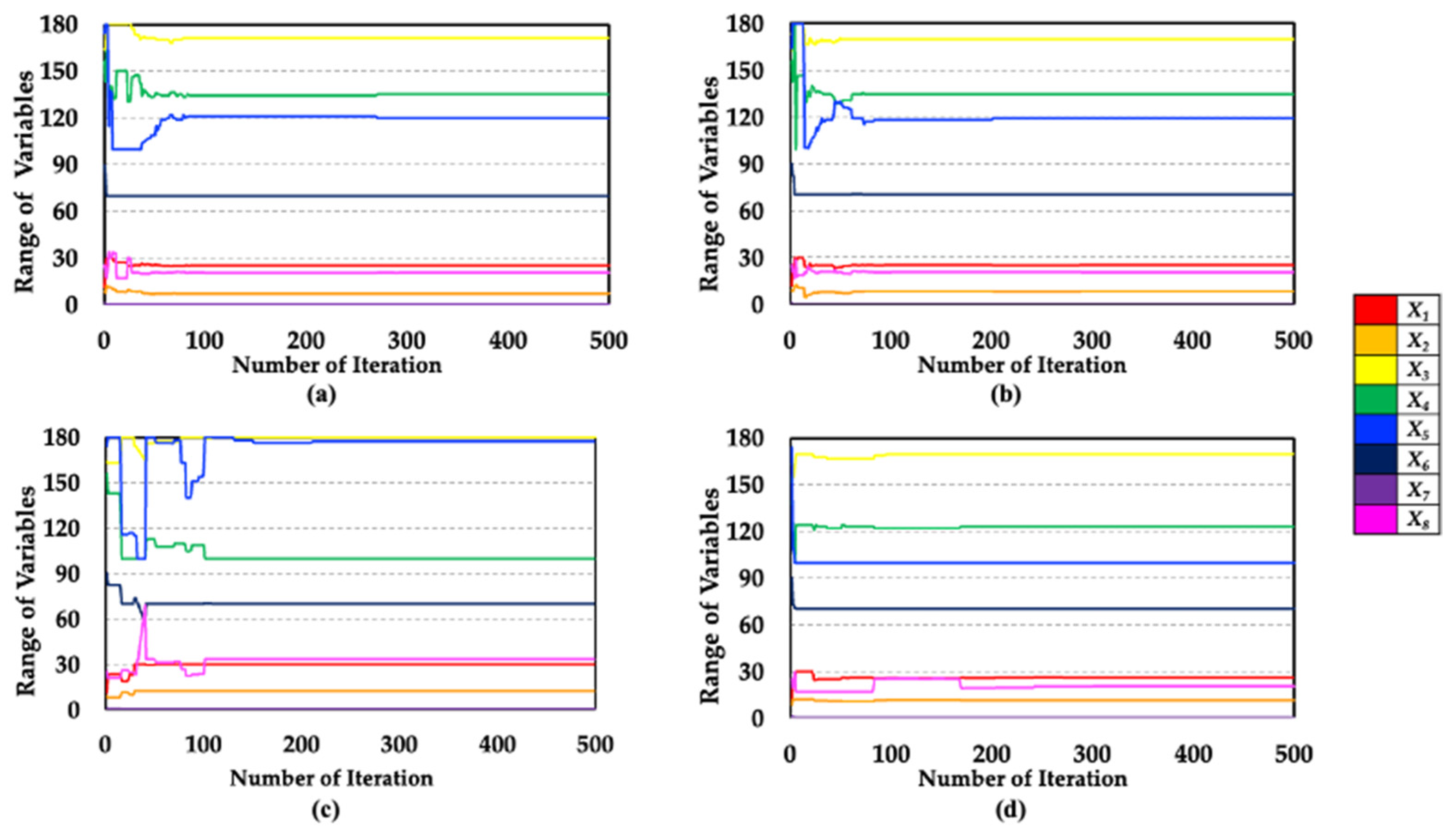 Convergence profile of design variables: (a) 1:10.2; (b) 1:10.4; (c) 1:10.5; (d) 1:10.66.