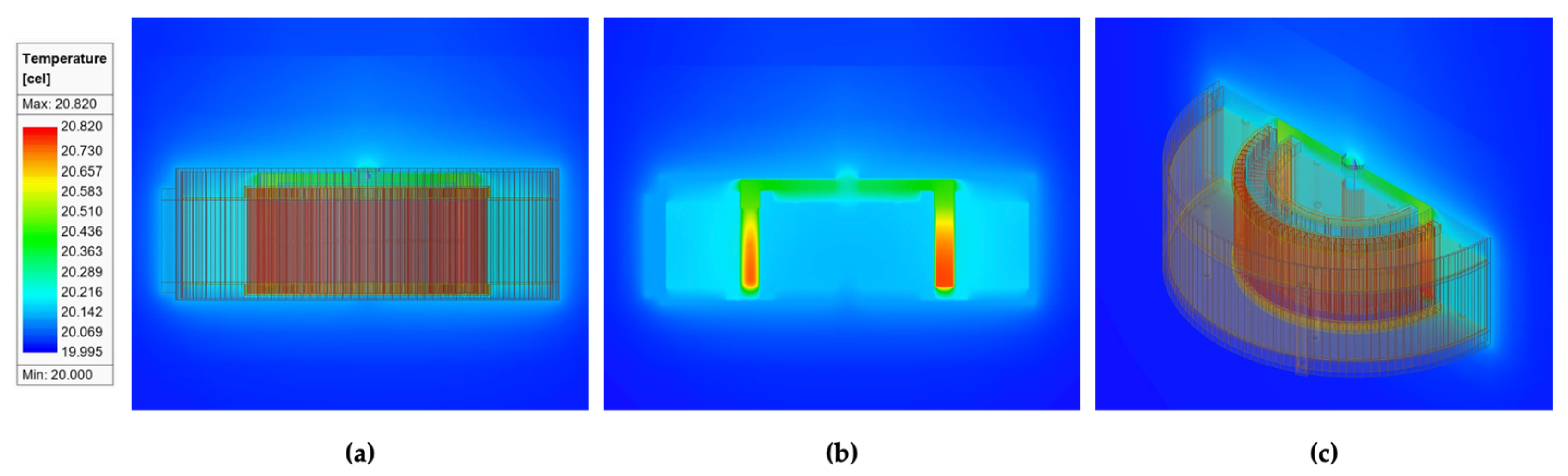 Transient temperature distribution of the optimized CMG model at s (10 min): (a) front view; (b) front view without CMG geometry; (c) isometric view.