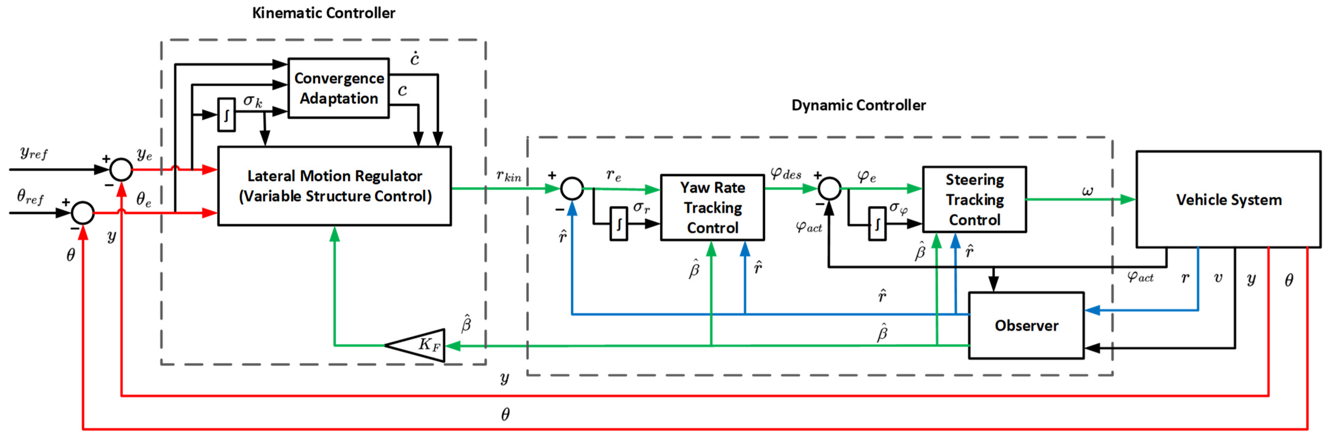 - Xin, M.; Yin, Y.; Zhang, K.; Lackner, D.; Ren, Z.; Minor, M. Continuous Robust Trajectory Tracking Control for Autonomous Ground Vehicles Considering Lateral and Longitudinal Kinematics and Dynamics via Recursive Backstepping. In Proceedings of the 2021 IEEE/RSJ International Conference on Intelligent Robots and Systems (IROS), Prague, Czech Republic, 27 September–1 October 2021; pp. 8373–8380. [Google Scholar] [CrossRef]