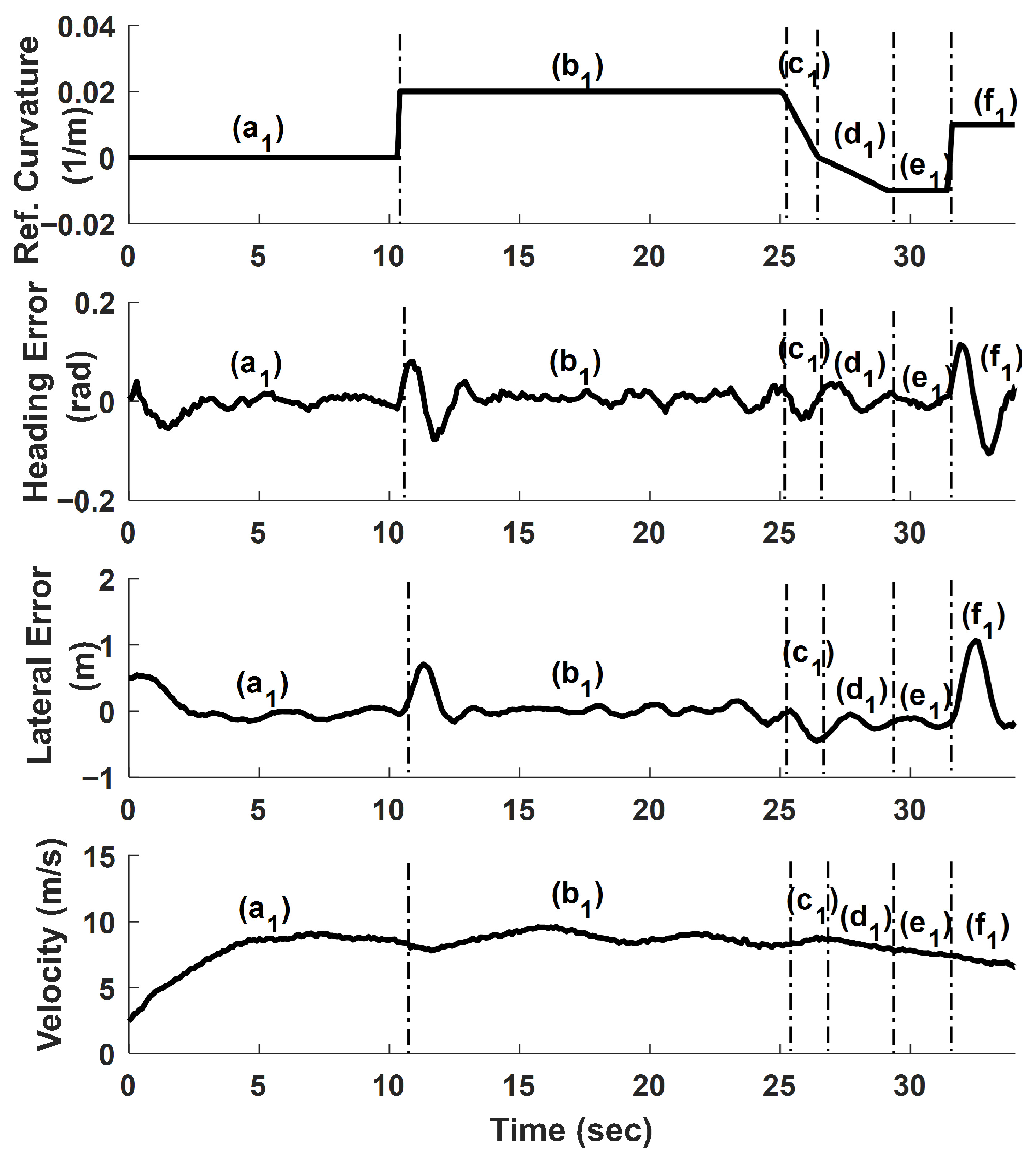 - Shi, Q.; Zhang, H. Road-Curvature-Range-Dependent Path Following Controller Design for Autonomous Ground Vehicles Subject to Stochastic Delays. IEEE Trans. Intell. Transp. Syst. 2022, 23, 17440–17450. [Google Scholar] [CrossRef]