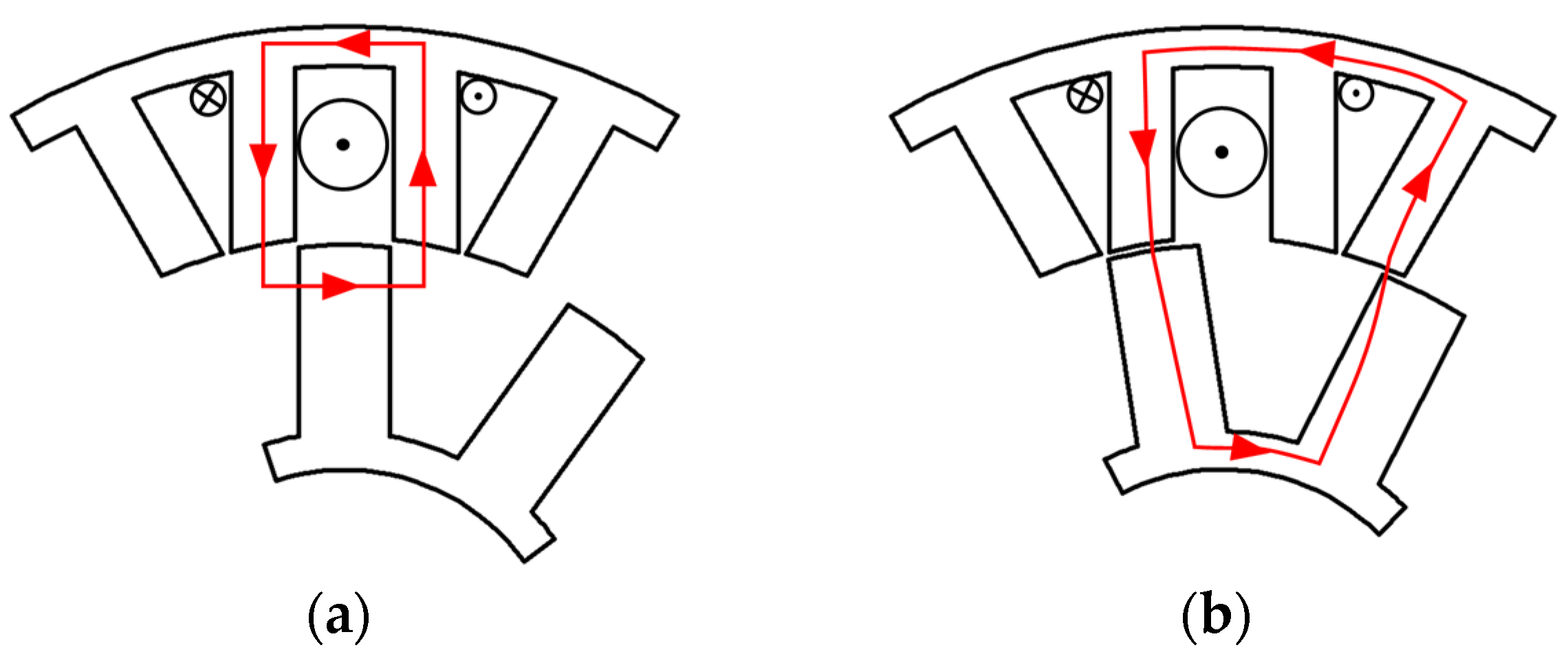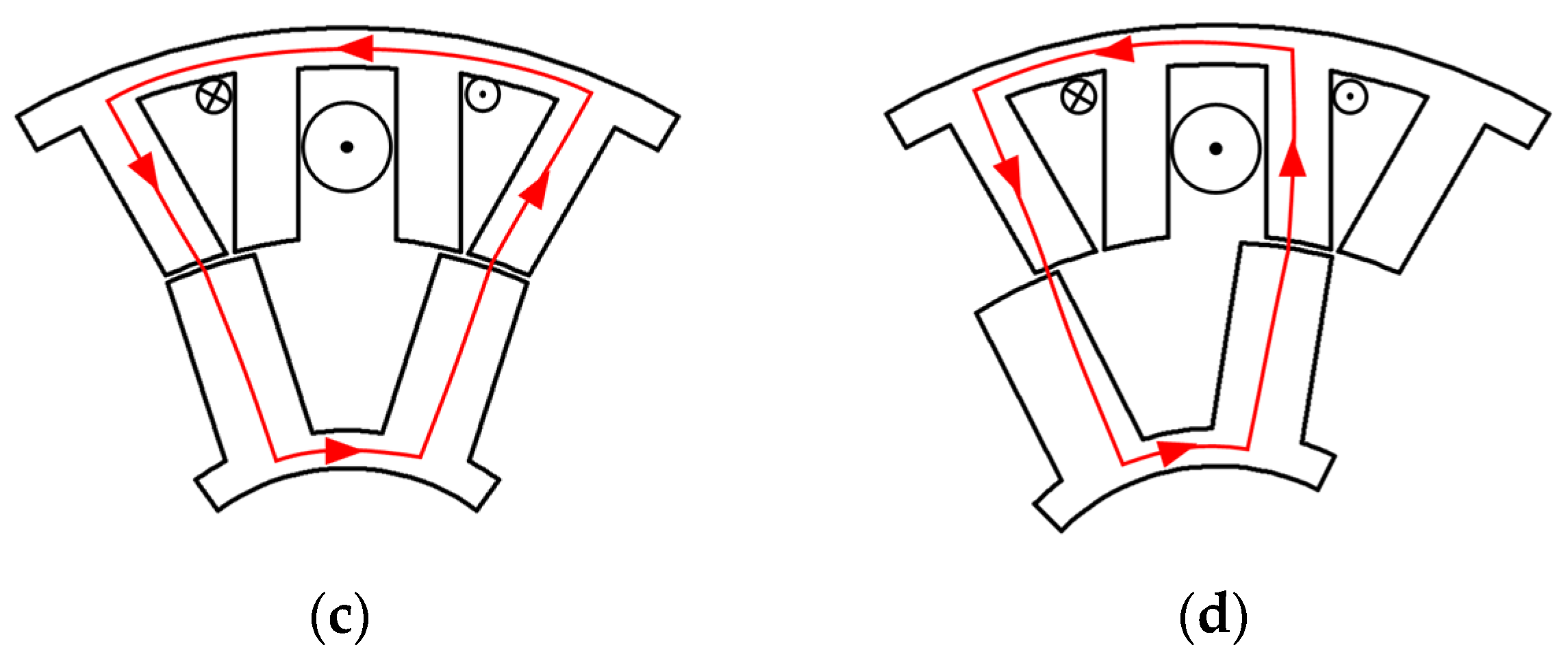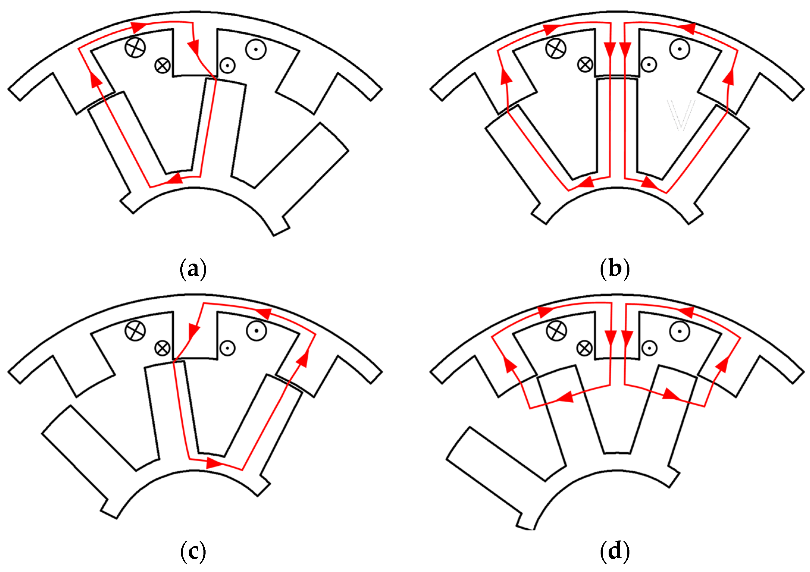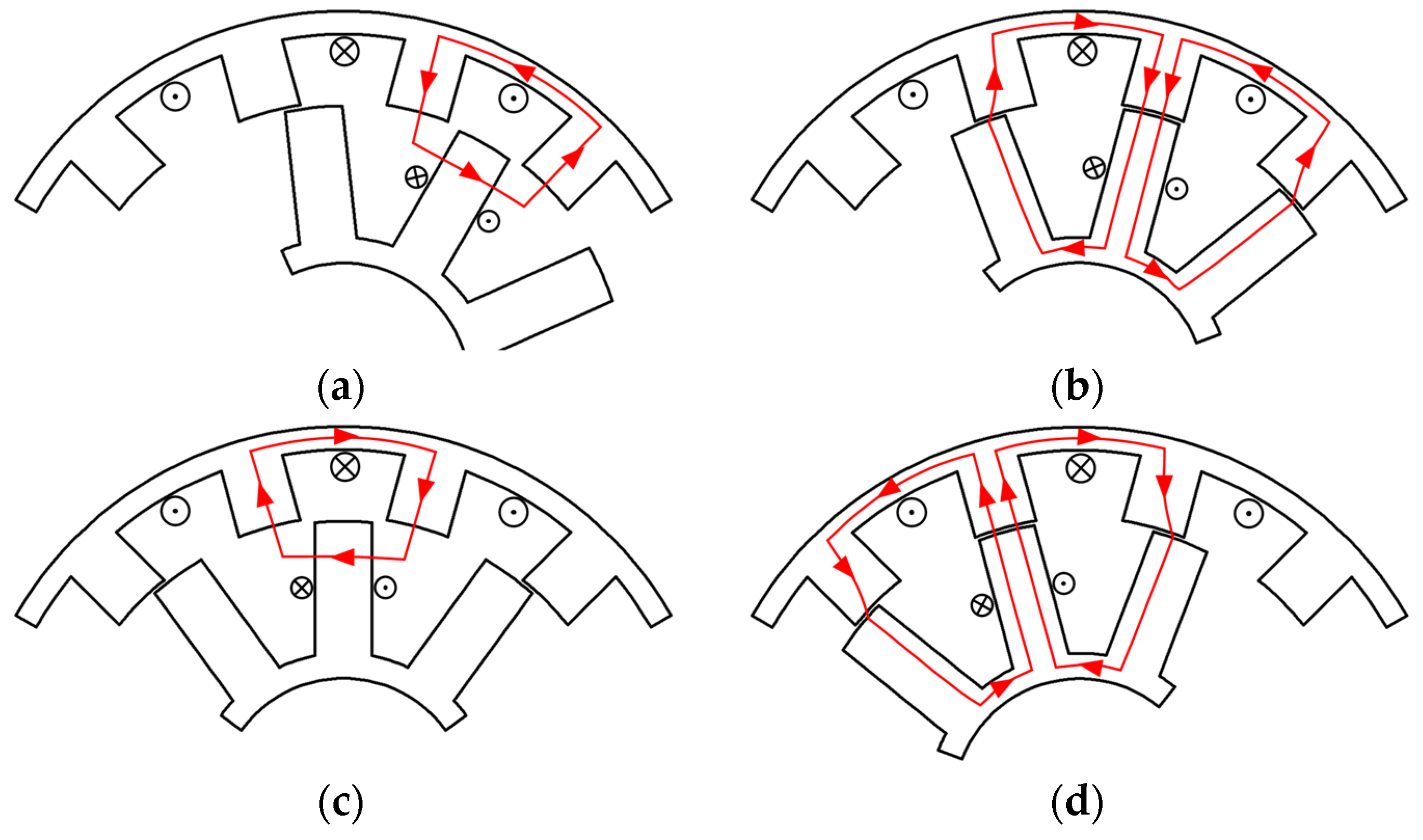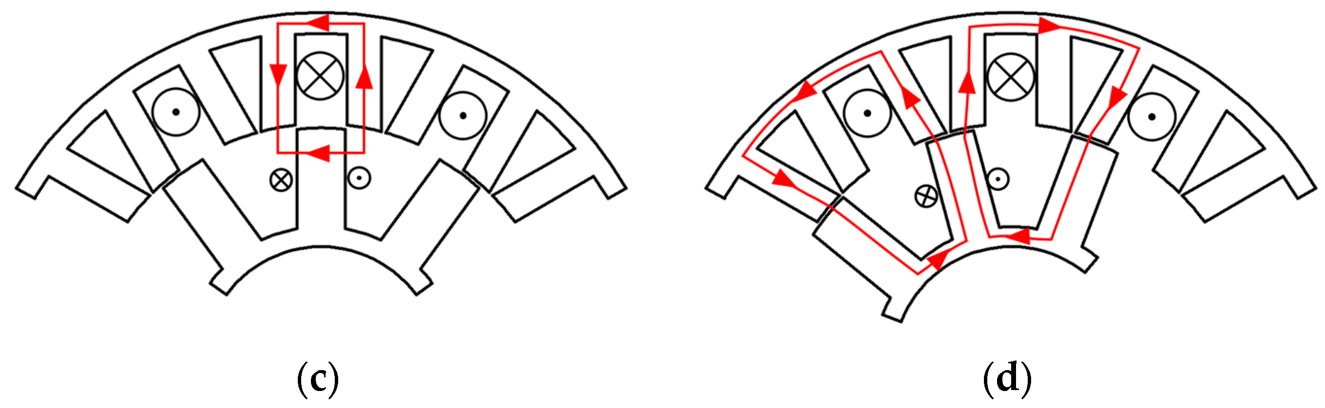 - Jiang, W.; Huang, W.; Lin, X.; Zhao, Y.; Wu, X.; Zhao, Y. A novel stator wound field flux switching machine with the combination of overlapping armature winding and asymmetric stator poles. IEEE Trans. Ind. Electron. 2022, 69, 2737–2748. [Google Scholar] [CrossRef]