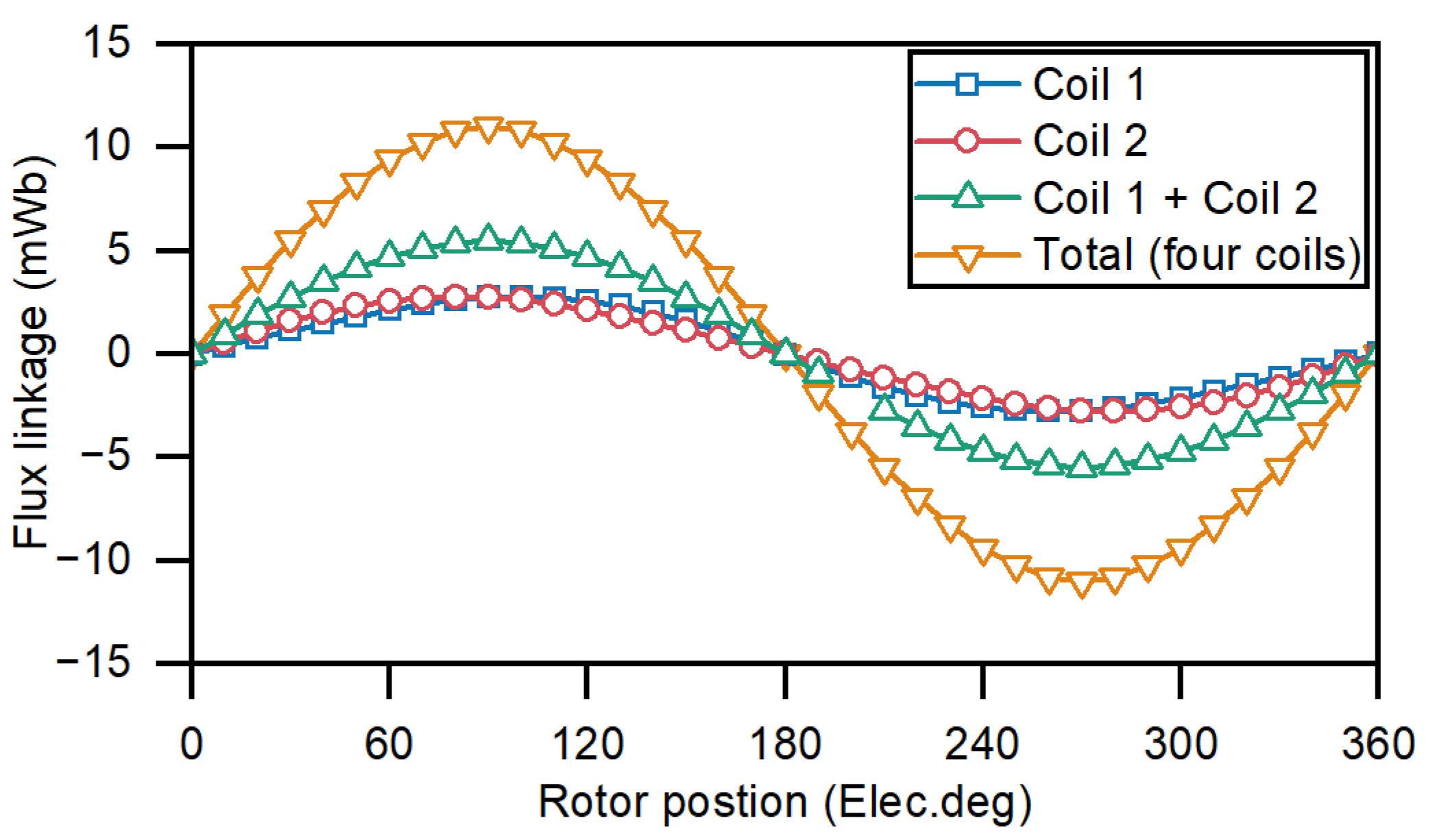 | Stator armature phase current, Ias | 2.82 Arms (10.2 A/mm2) | 1.35 Arms (11.1 A/mm2) | 2.38 Arms (12.3 A/mm2) | 0.96 Arms (7.5 A/mm2) |
