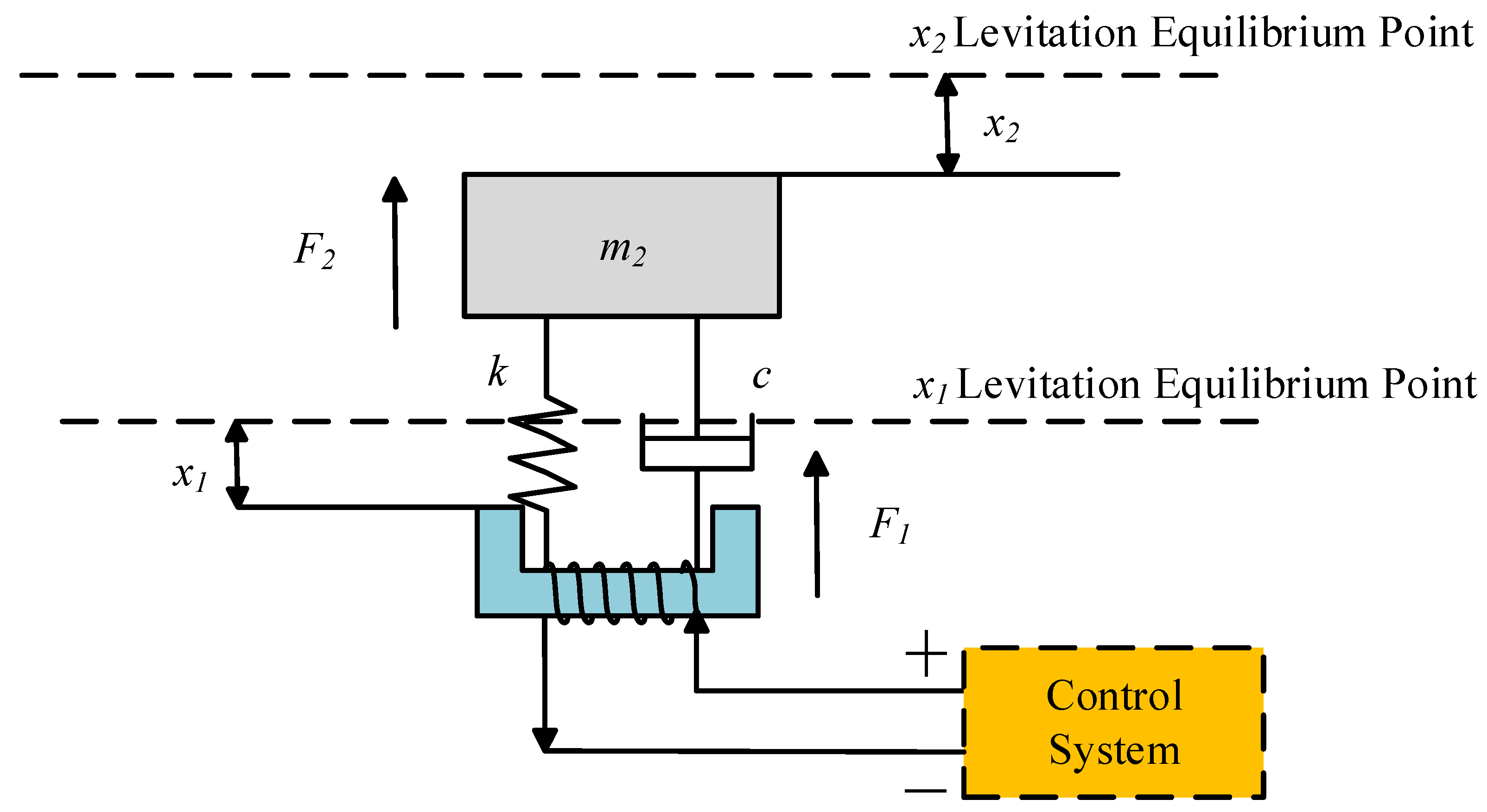 In Figure 2, x 1 and x 2 denote the displacements of the electromagnet and the vehicle body, respectively; m 1 and m 2 represent the masses of the electromagnet and the vehicle body; and F 1 and F 2 correspond to the electromagnetic force and the spring–damper force, respectively. In the following analysis, the upward direction is taken as positive.