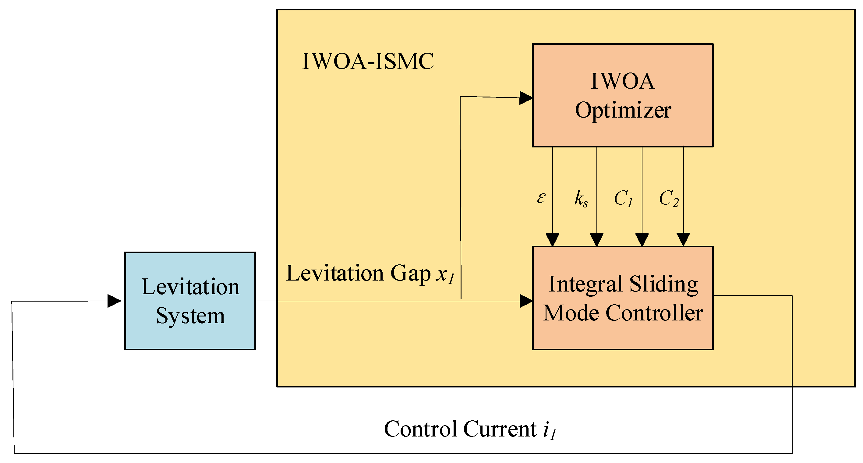 Integral sliding mode control exhibits strong robustness in suppressing system uncertainties and external disturbances; however, its control performance is highly dependent on the selection of controller parameters. Improper parameter configuration may result in slow system response or even induce chattering phenomena. Given the strong nonlinearity of the levitation system, experience-based parameter tuning methods are insufficient to obtain an optimal parameter combination. Therefore, an improved whale optimization algorithm (IWOA) is introduced to globally optimize the parameters of the integral sliding mode controller, thereby enhancing the dynamic performance and robustness of the system. The proposed IWOA-ISMC framework is illustrated in Figure 6.