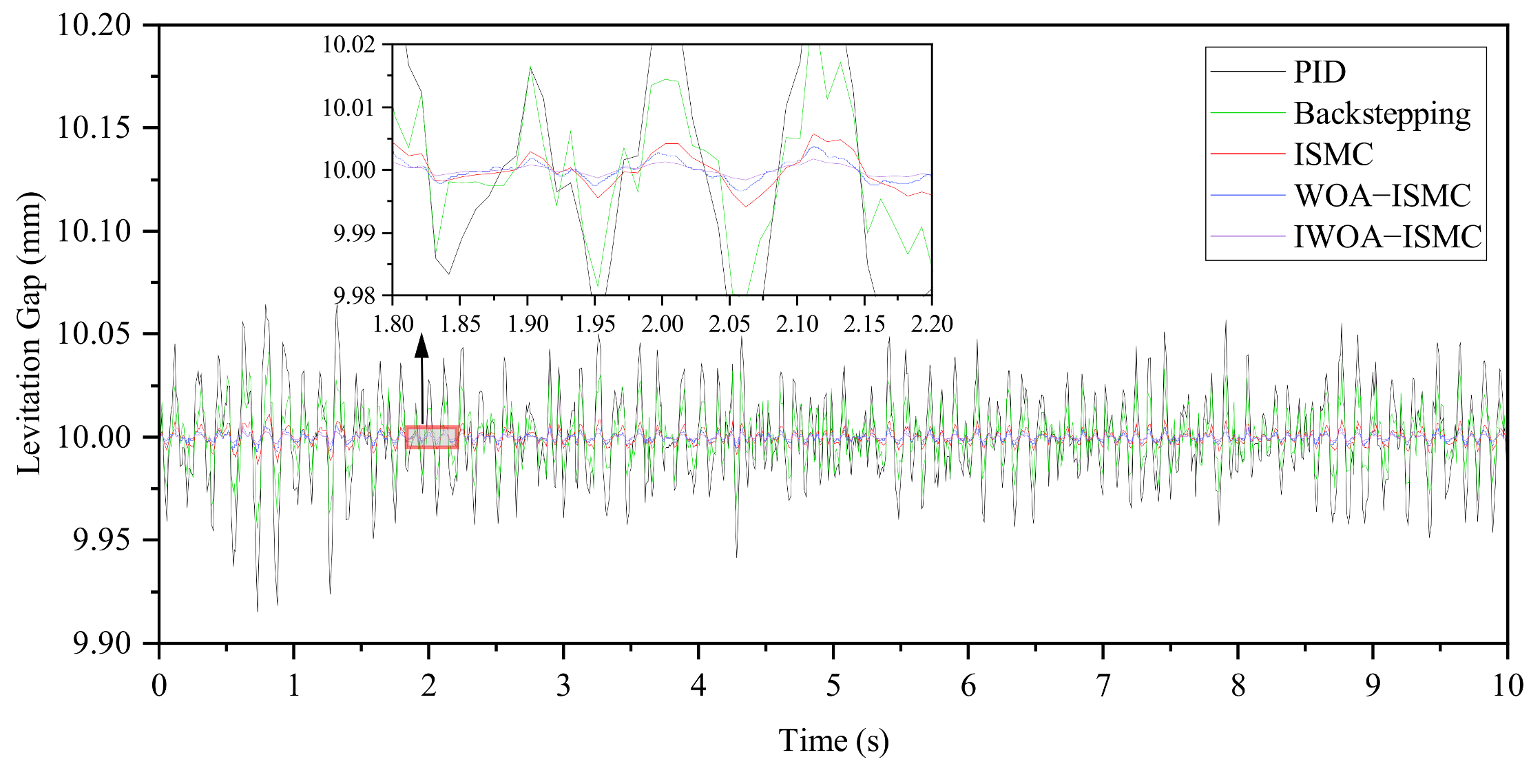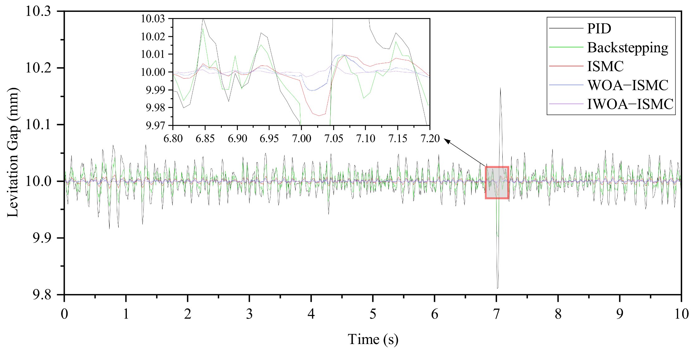 To ensure the accuracy and reproducibility of the simulation study, the implementation parameters of the considered controllers are explicitly provided. For the integral sliding mode controller (ISMC), the key gains are set as follows: error gain c 1 = 100 , integral error gain c 2 = 50 , feedback gain ε = 1 , and switching gain k s = 10 , 000 , which is introduced to enhance robustness against disturbances. For the backstepping controller, the parameters are selected as c 11 = 500 and c 22 = 120 . As a widely used benchmark, the PID controller parameters are set to k p = 61 , 508 , k i = 1 , 943 , 374 , and k d = 752.7 . These preset parameters ensure that all controllers can achieve basic stable levitation prior to IWOA optimization, thereby allowing subsequent performance improvements to be clearly attributed to the optimization effect of IWOA rather than to differences in initial parameter settings.