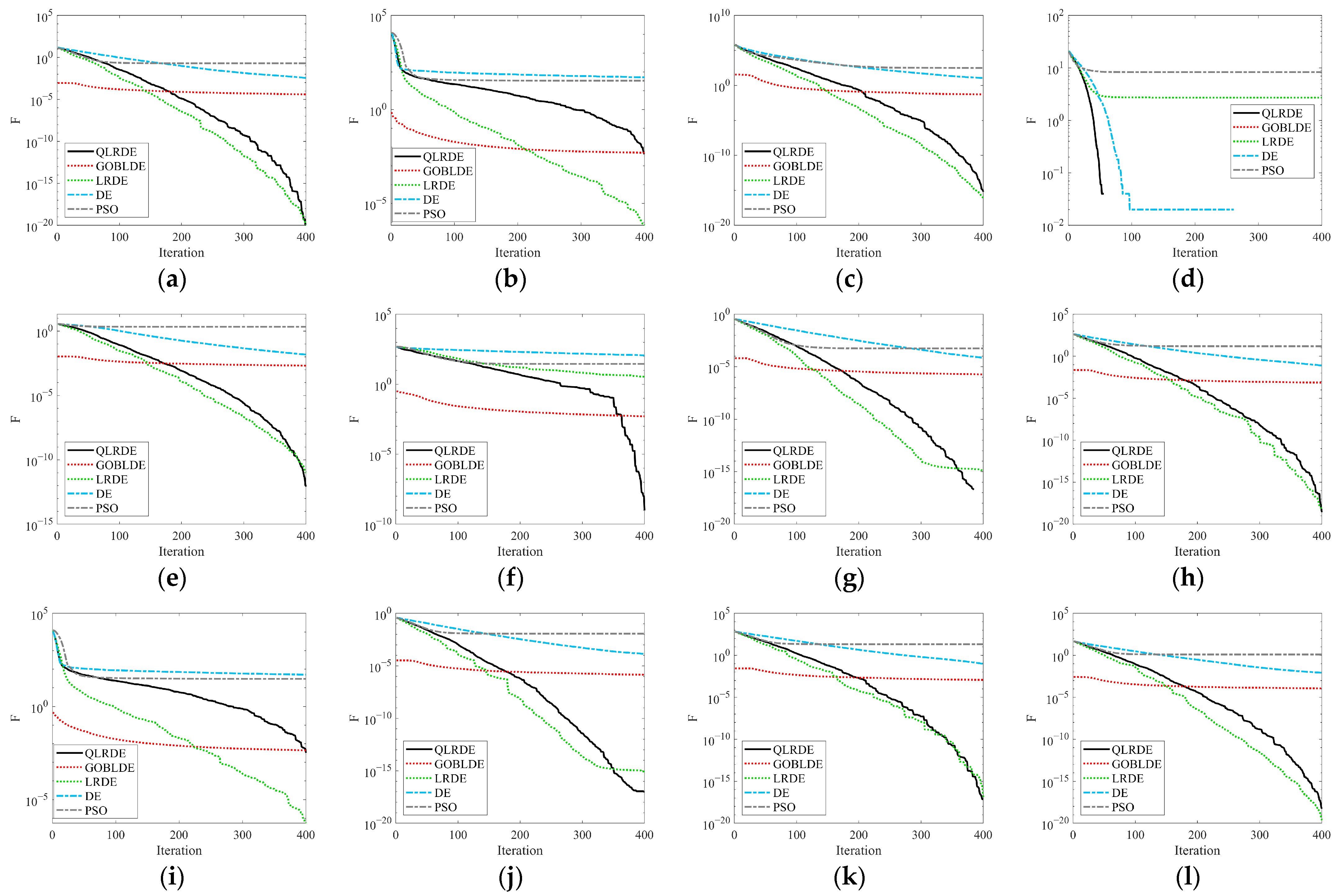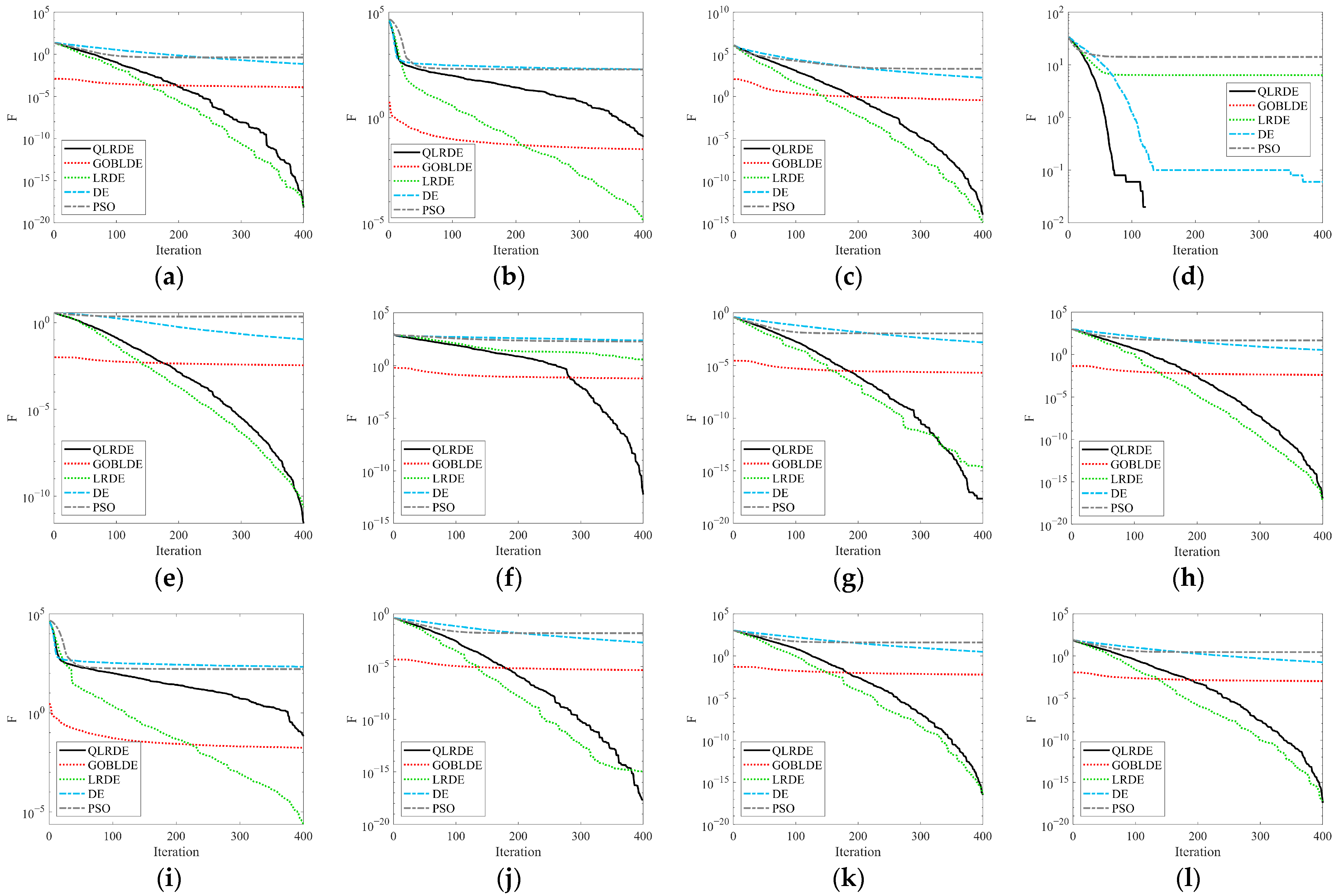 Table 7 indicate that QLRDE achieves the minimum values in all five metrics: best, mean, median, worst, and std, with each optimal value highlighted in bold. This indicates that QLRDE possesses the strongest optimization capability in a statistical sense. Algorithm execution efficiency can be evaluated using the average time (AT, representing the average time the algorithm runs once). The data in