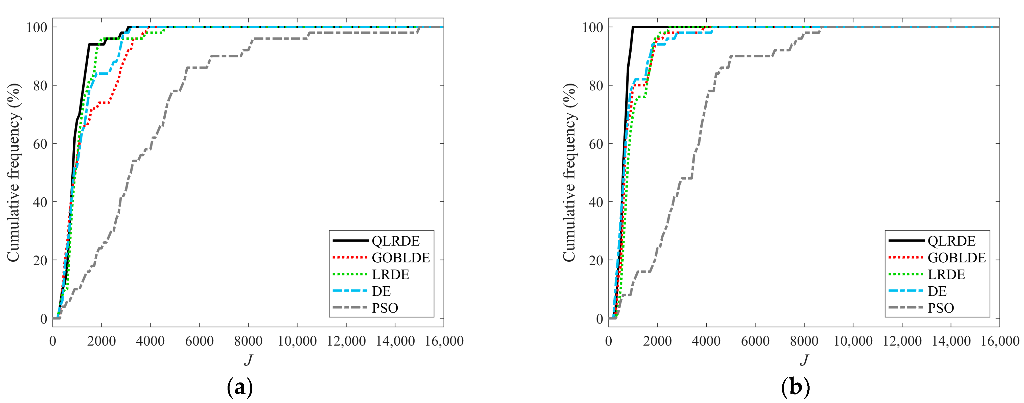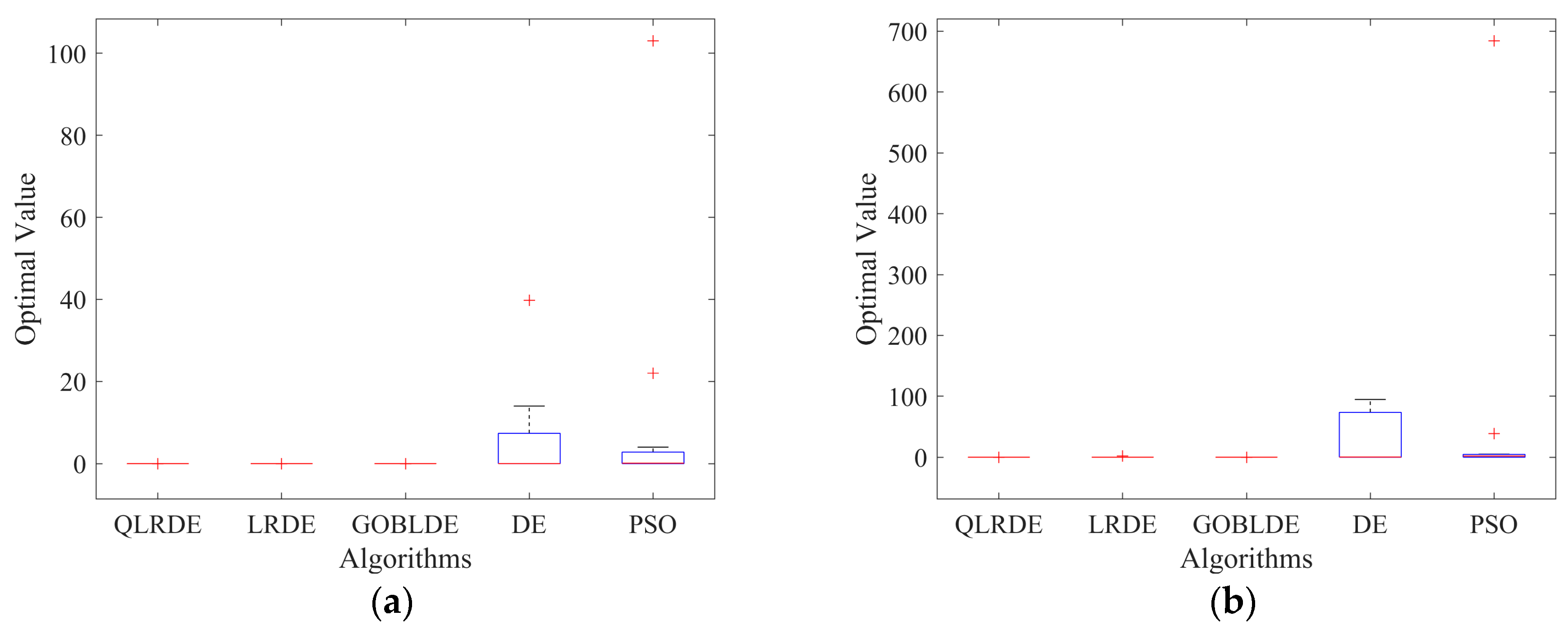 Table 7 indicate that QLRDE achieves shorter average time in both test cases, outperforming LRDE and GOBLDE, while remaining competitive with DE and PSO.