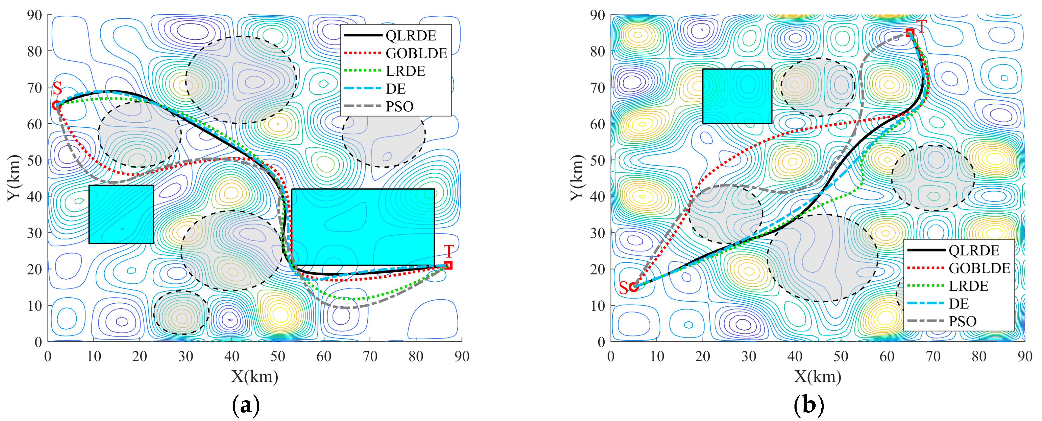 To evaluate experimental evaluation of the designed QLRDE-based path planner, several comparative simulation experiments are conducted. This section focuses on comparing the QLRDE algorithm with several other algorithms, including the LRDE algorithm, the GOBLDE algorithm, the standard DE algorithm, and the PSO algorithm under two mission cases. A fair comparison was ensured by adopting identical settings for all algorithms, with the maximum iteration count as the termination criterion and a population size of Mpop = 40. The simulation environment consisted of MATLAB-2024a running on a standard personal computer, on which all algorithms were implemented.