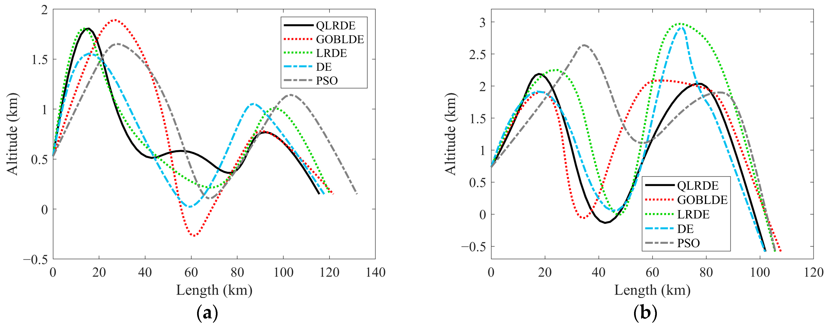 Figure 7 displays the altitude profiles of the best-performing paths for Case 1 and Case 2. The results show that after 50 runs, all five optimization algorithms successfully generated feasible paths avoiding all danger zones. However, the paths generated by the QLRDE algorithm have the shortest length while also exhibiting smaller variations in flight altitude. The QLRDE algorithm effectively combines threat avoidance and path optimization, significantly enhancing the survivability and mission effectiveness of the aircraft. Compared to the paths obtained by LRDE, GOBLDE, DE, and PSO, the QLRDE-generated paths yield superior cost metrics and smaller standard deviations, demonstrating its stronger search capability.
