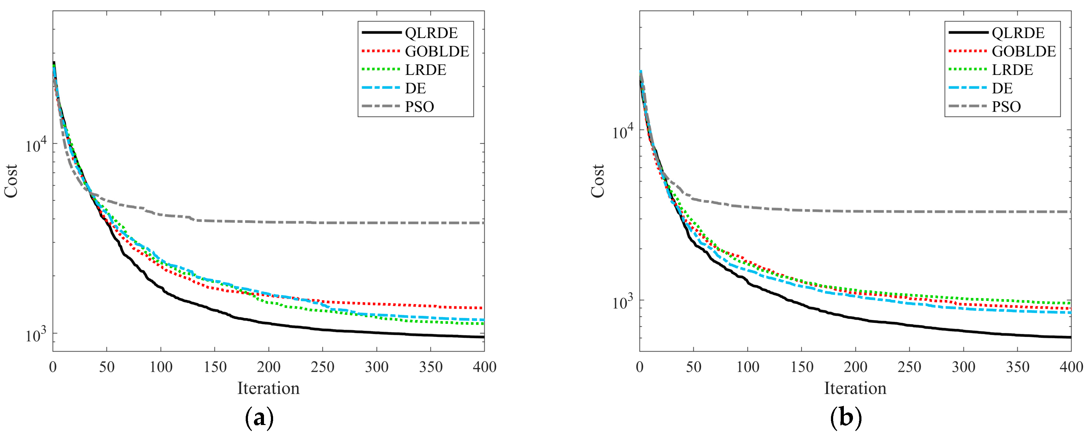 Figure 8 presents the convergence curves, showing that the QLRDE converges faster and achieves lower cost values than its counterparts.
