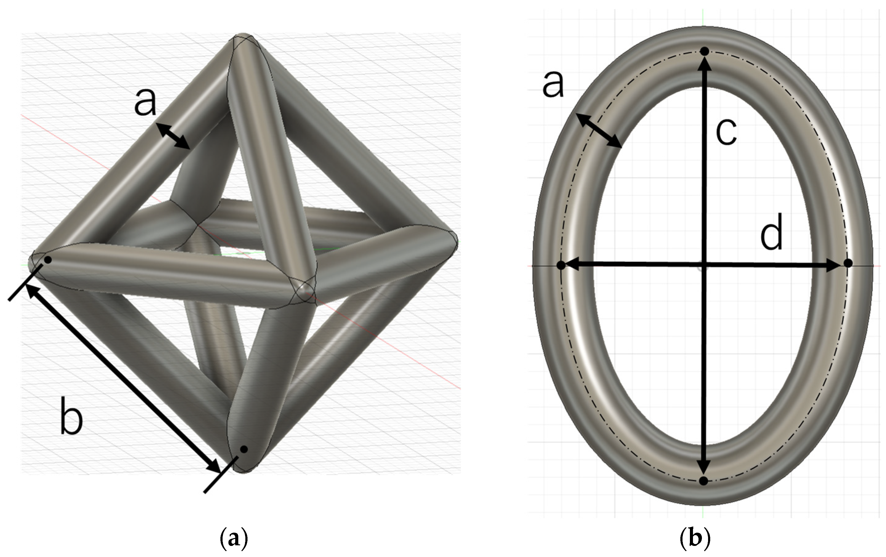 Figure 1b). The hollow octahedral chain particles provide multiple contact points during linkage and contribute to a lightweight structure due to their low density. To arrange the chain particles three-dimensionally, elliptical chain particles are also used in some areas. The pipe diameter of each chain particle is defined as ‘a’. The side length parameter of the hollow octahedral chain particle is defined as ‘b’, and the major and minor axes of the elliptical chain particle are defined as ‘c’ and ‘d’, respectively.
