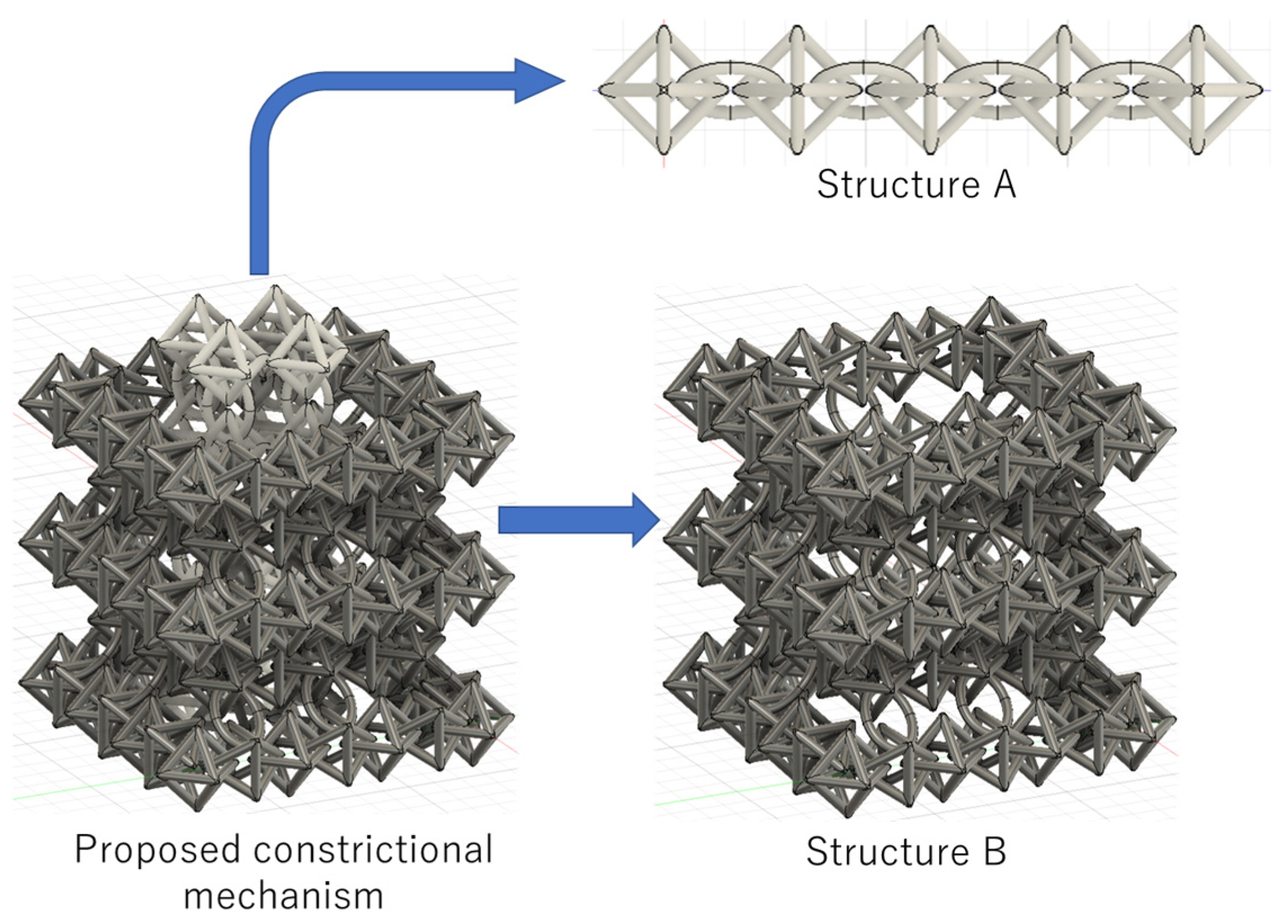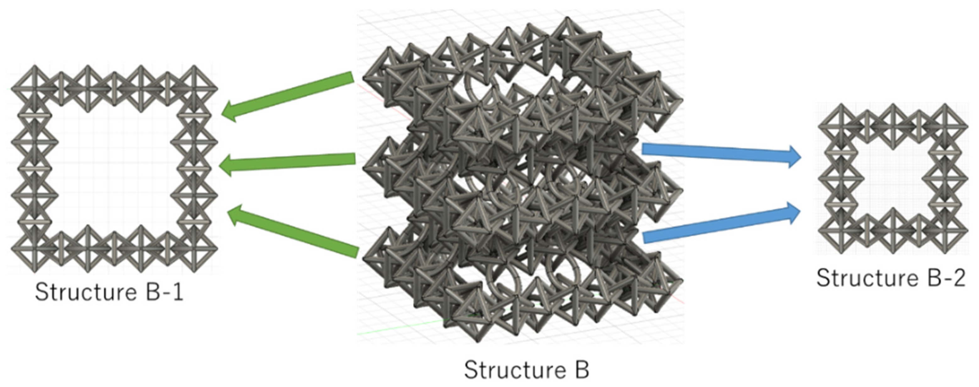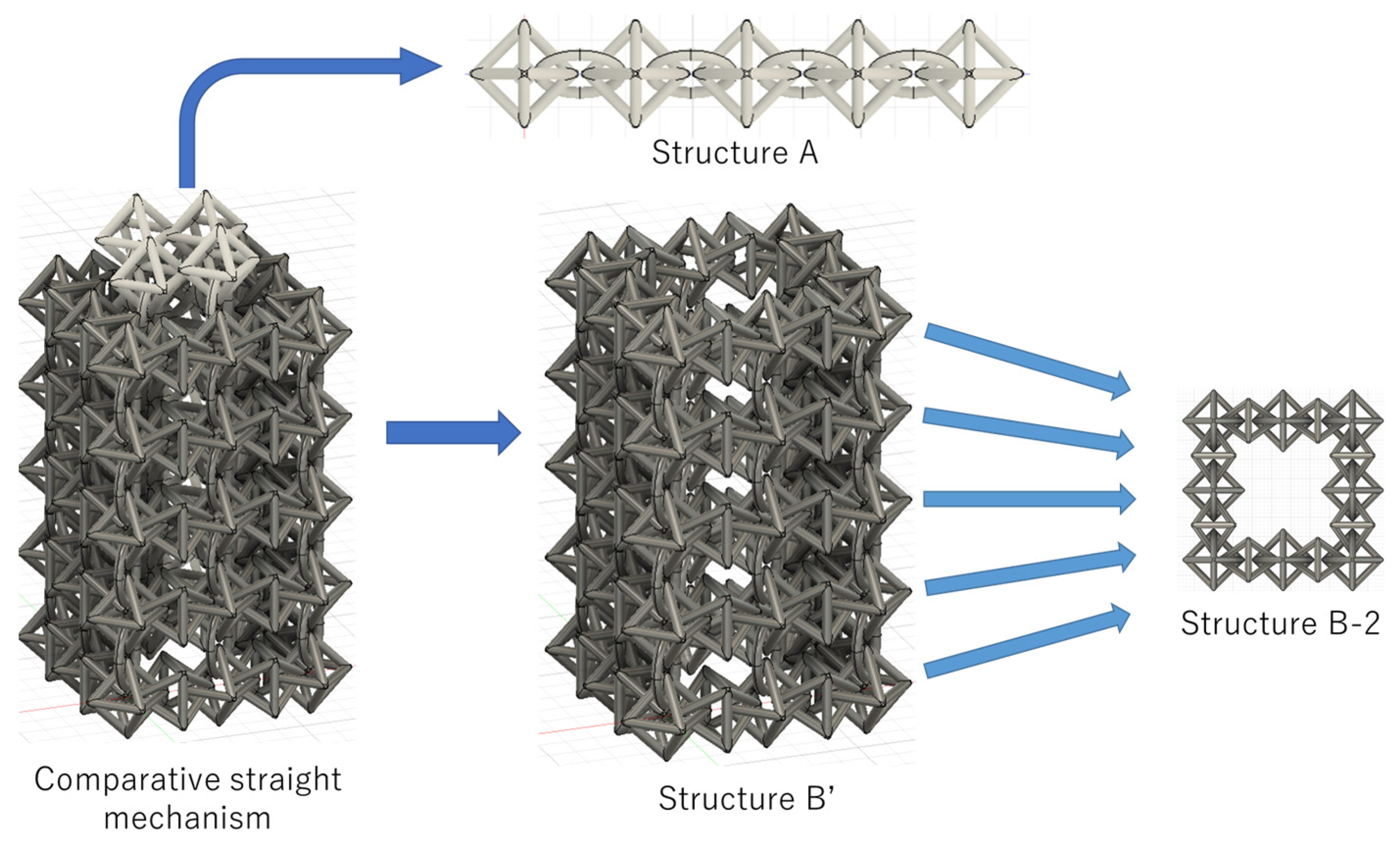 Figure 5. The straight mechanism consists of a tubular structure (Structure B′) composed of five Structure B-2 units, with four Structure A units placed inside Structure B′. Because Structure B′ in the straight mechanism lacks constrictions, inward compression does not occur when mass is applied from above. Consequently, the stiffness of the straight mechanism is expected to be lower than that of the constrictional mechanism.