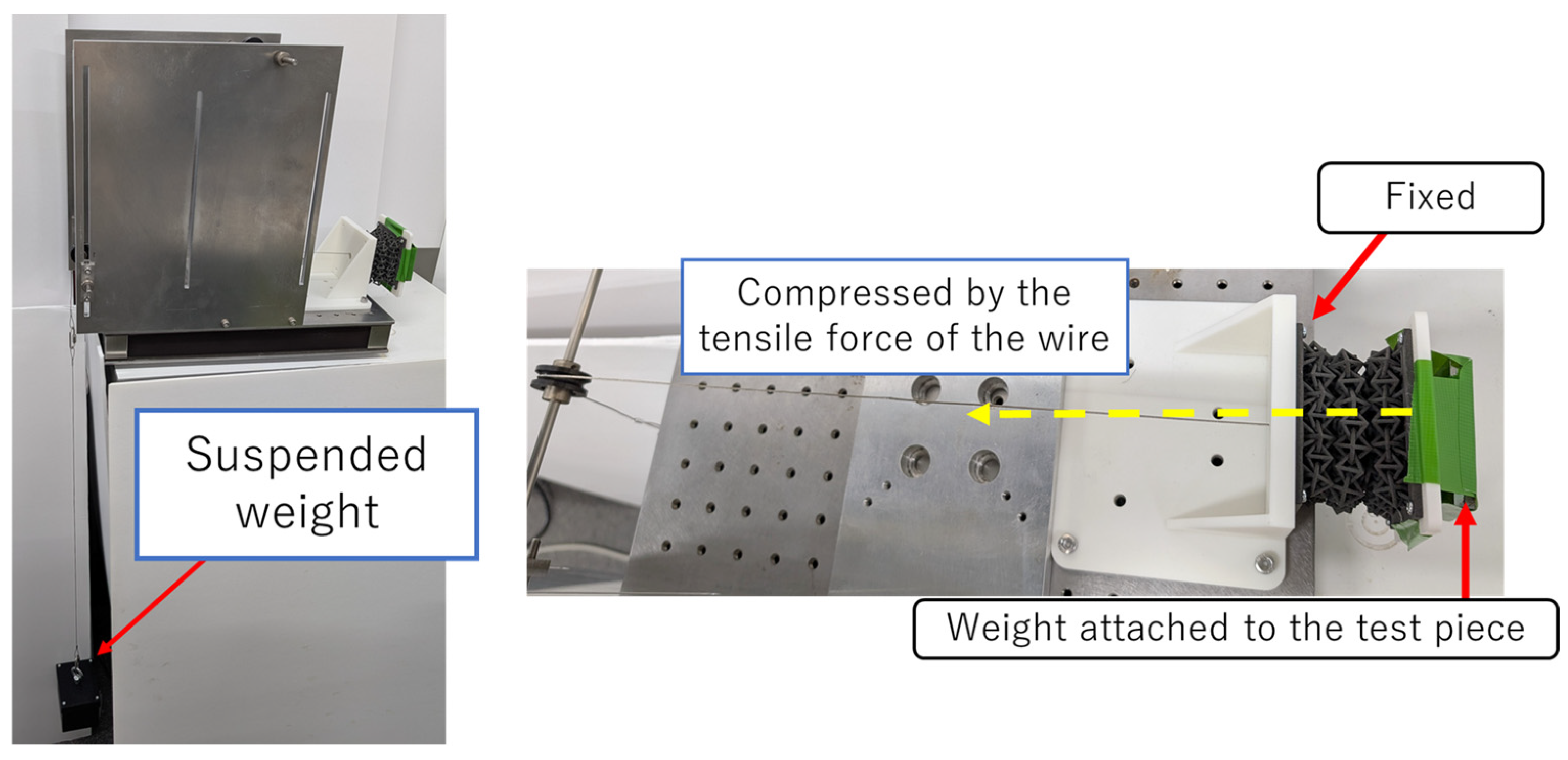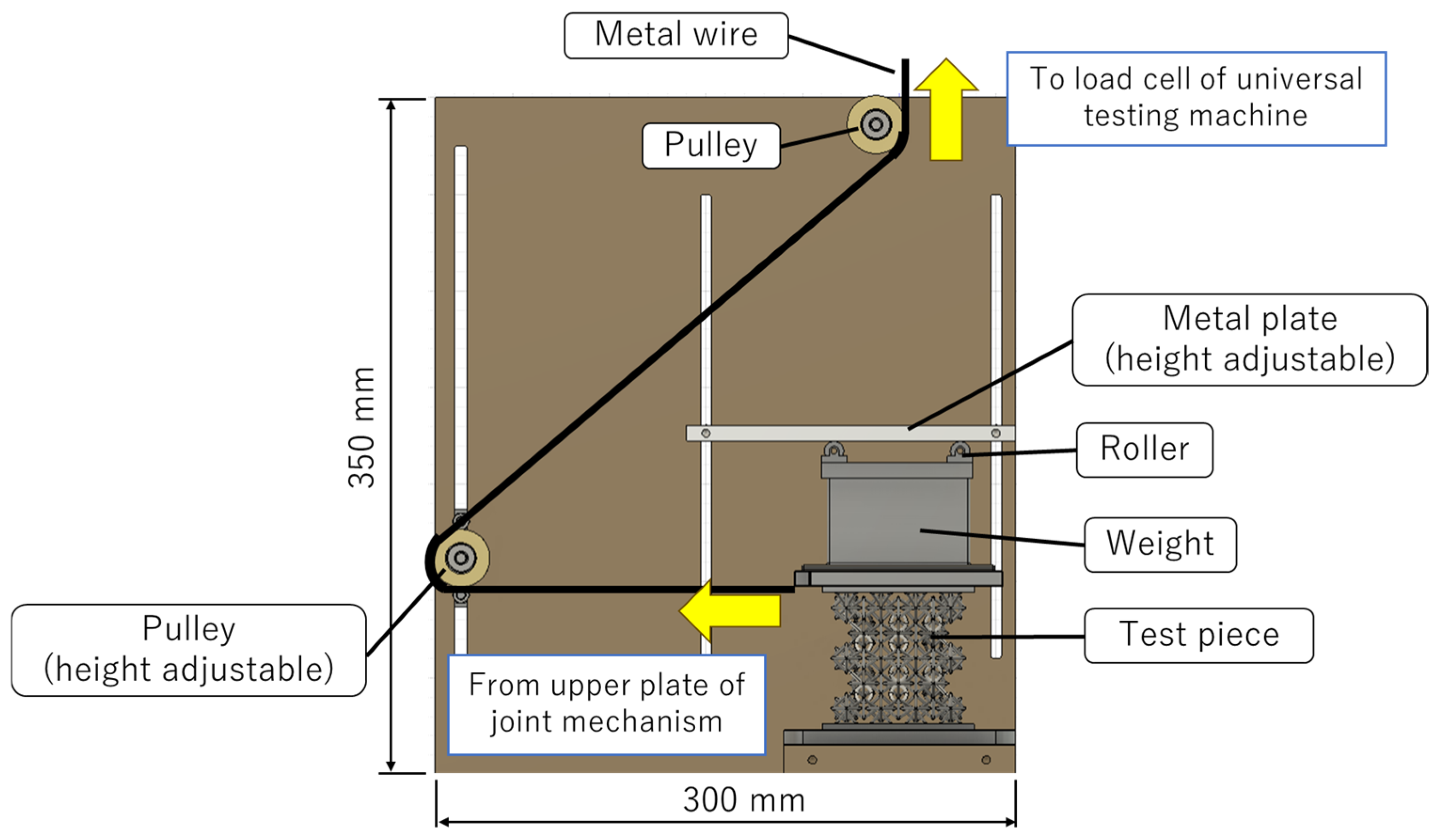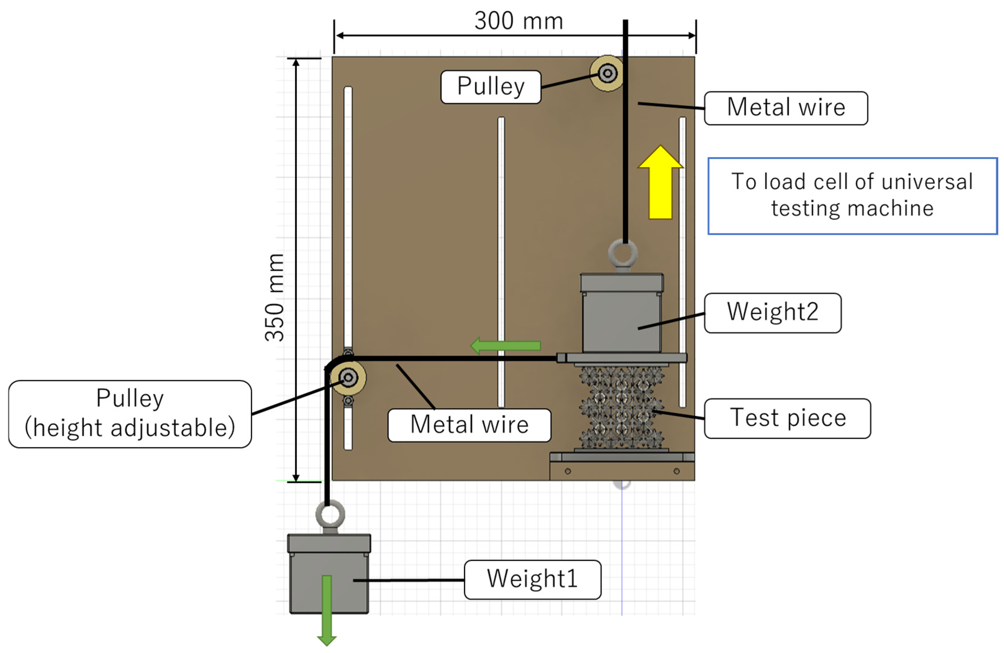 The base of this fixture was mounted onto the universal testing machine, and the test specimen was attached. Two metal rods were installed so they spanned both ends of the fixture, with a pulley mounted at the center of each. A wire was attached to one side of the upper end of the test specimen. The other end of this wire was connected to a weight (referred to as Weight 1). This weight was suspended downward via the pulley, applying a shearing force to the test specimen. The height of the metal rod with the lower pulley was adjusted so that the wire pulled the test specimen horizontally. This arrangement enabled the force exerted by the wire with Weight 1 to be regarded as a shearing force. Another weight (referred to as Weight 2) was placed on top of the test specimen to compress it. A different wire was connected to Weight 2. The other end of this wire was connected to the gripper of the universal testing machine’s load cell. Weight 2 was pulled upward via this wire.