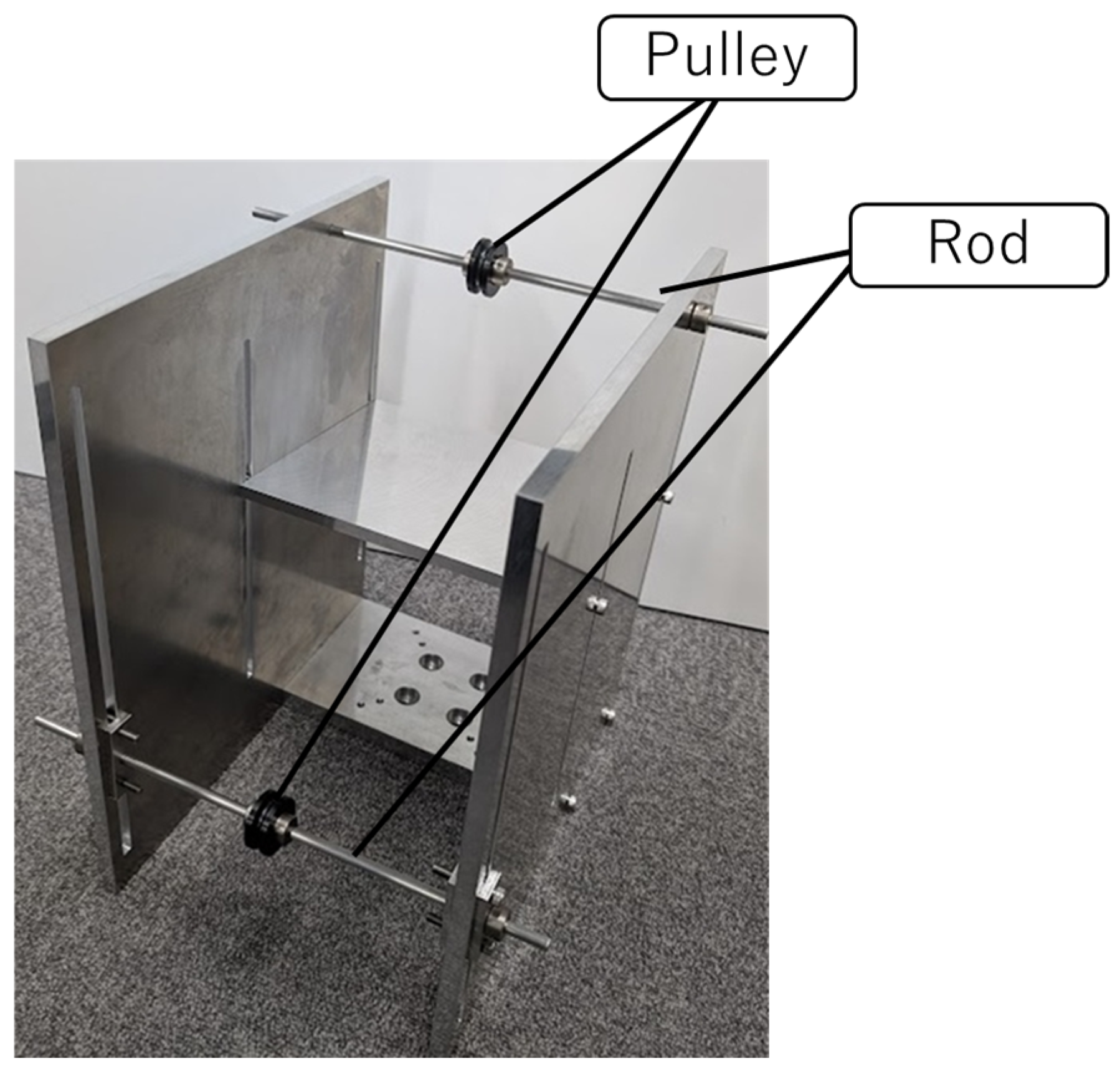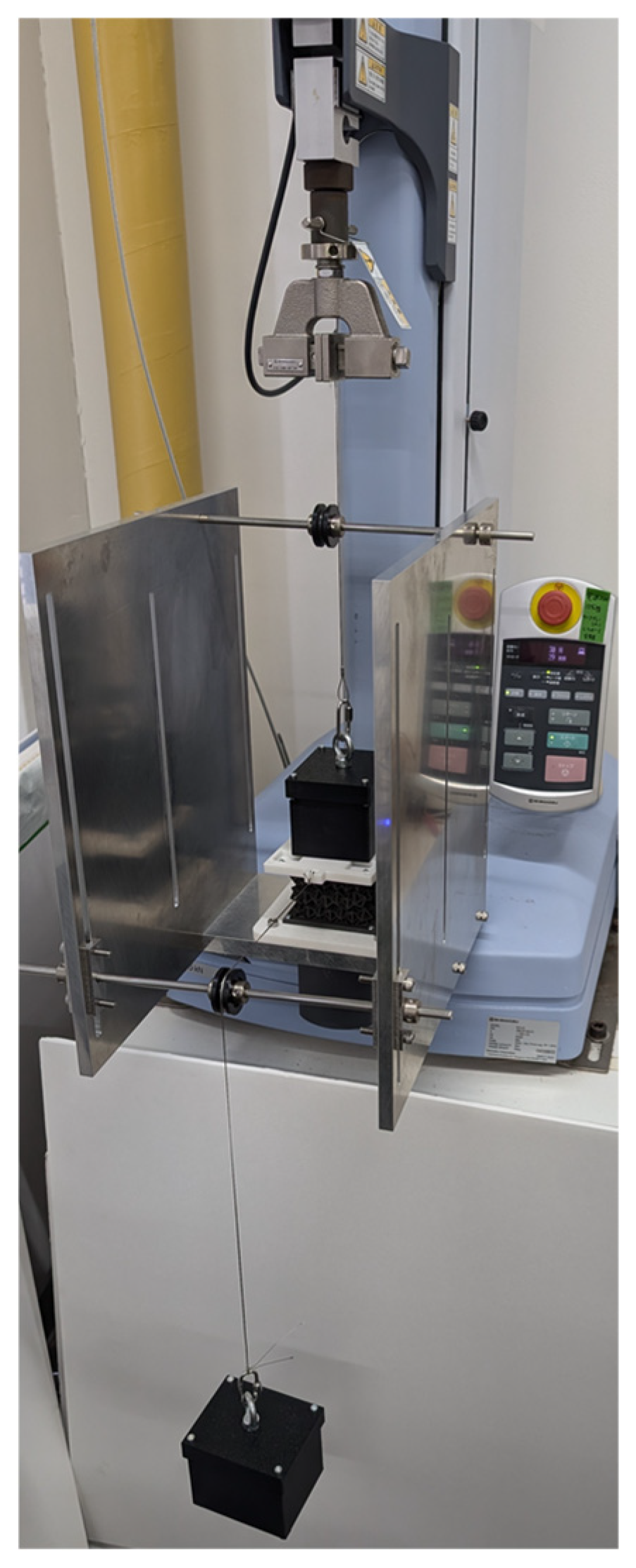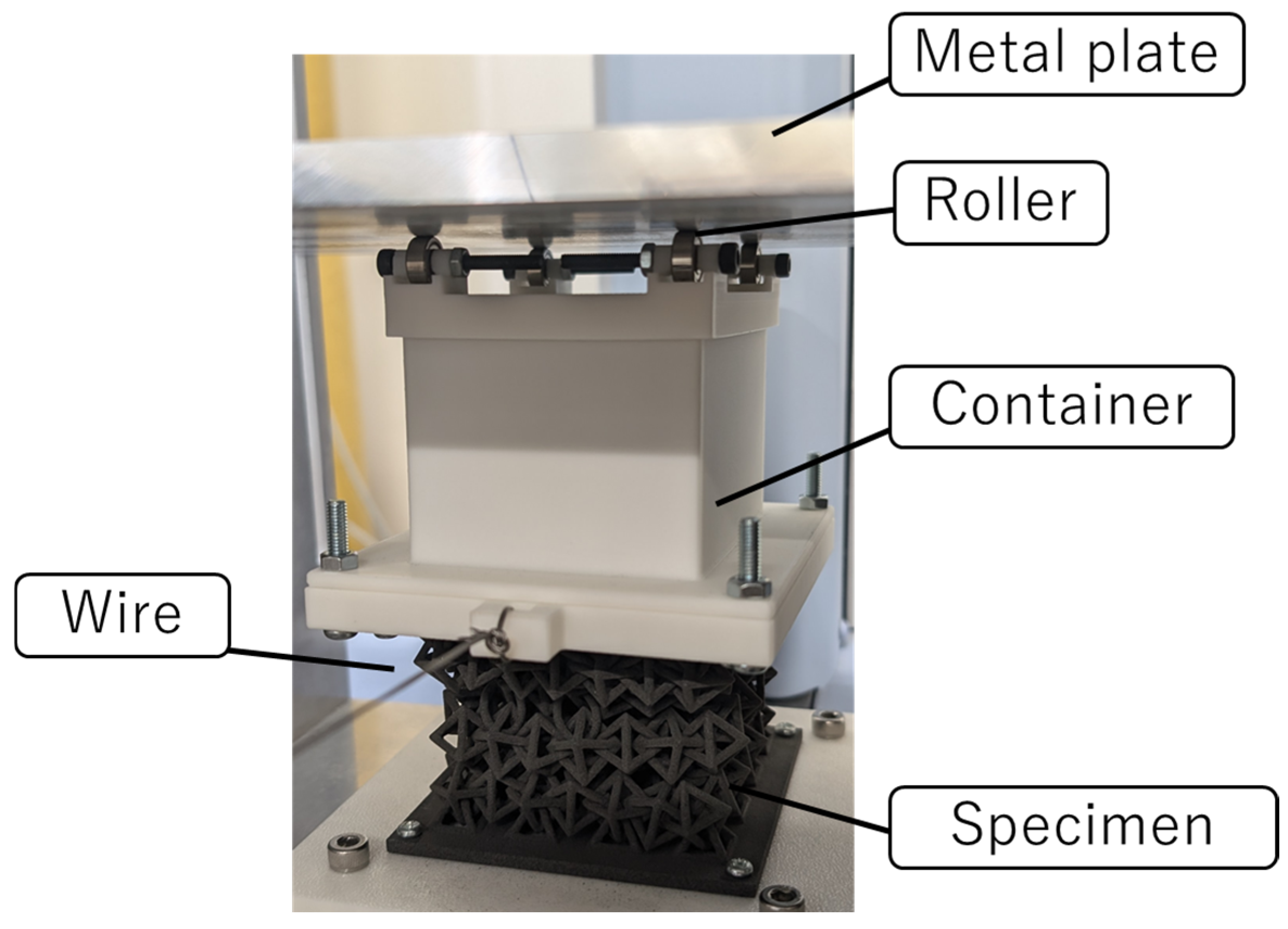 The base of this fixture was mounted onto the universal testing machine, and the test specimen was attached. Two metal rods were installed so they spanned both ends of the fixture, with a pulley mounted at the center of each. A wire was attached to one side of the upper end of the test specimen. The other end of this wire was connected to a weight (referred to as Weight 1). This weight was suspended downward via the pulley, applying a shearing force to the test specimen. The height of the metal rod with the lower pulley was adjusted so that the wire pulled the test specimen horizontally. This arrangement enabled the force exerted by the wire with Weight 1 to be regarded as a shearing force. Another weight (referred to as Weight 2) was placed on top of the test specimen to compress it. A different wire was connected to Weight 2. The other end of this wire was connected to the gripper of the universal testing machine’s load cell. Weight 2 was pulled upward via this wire.