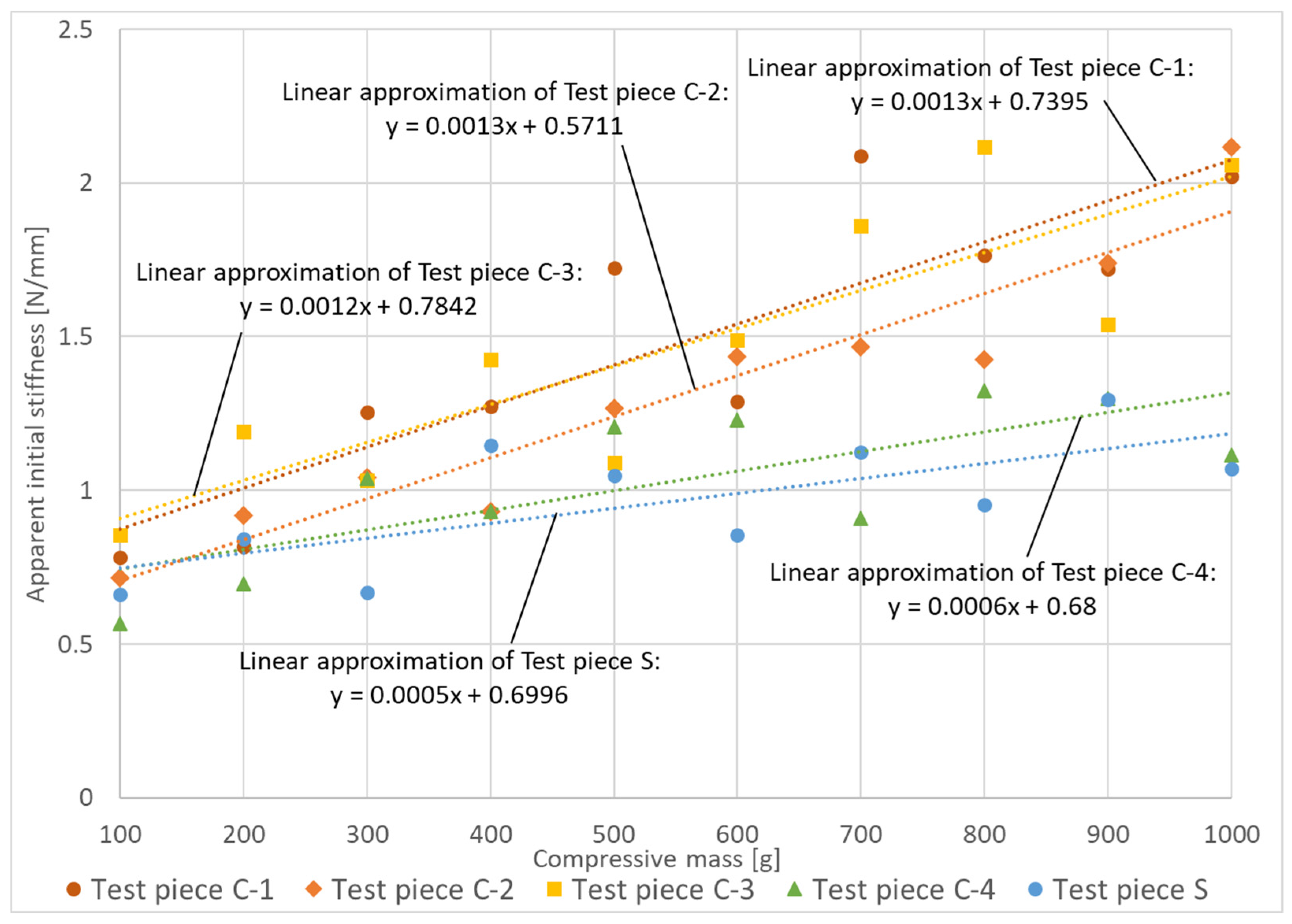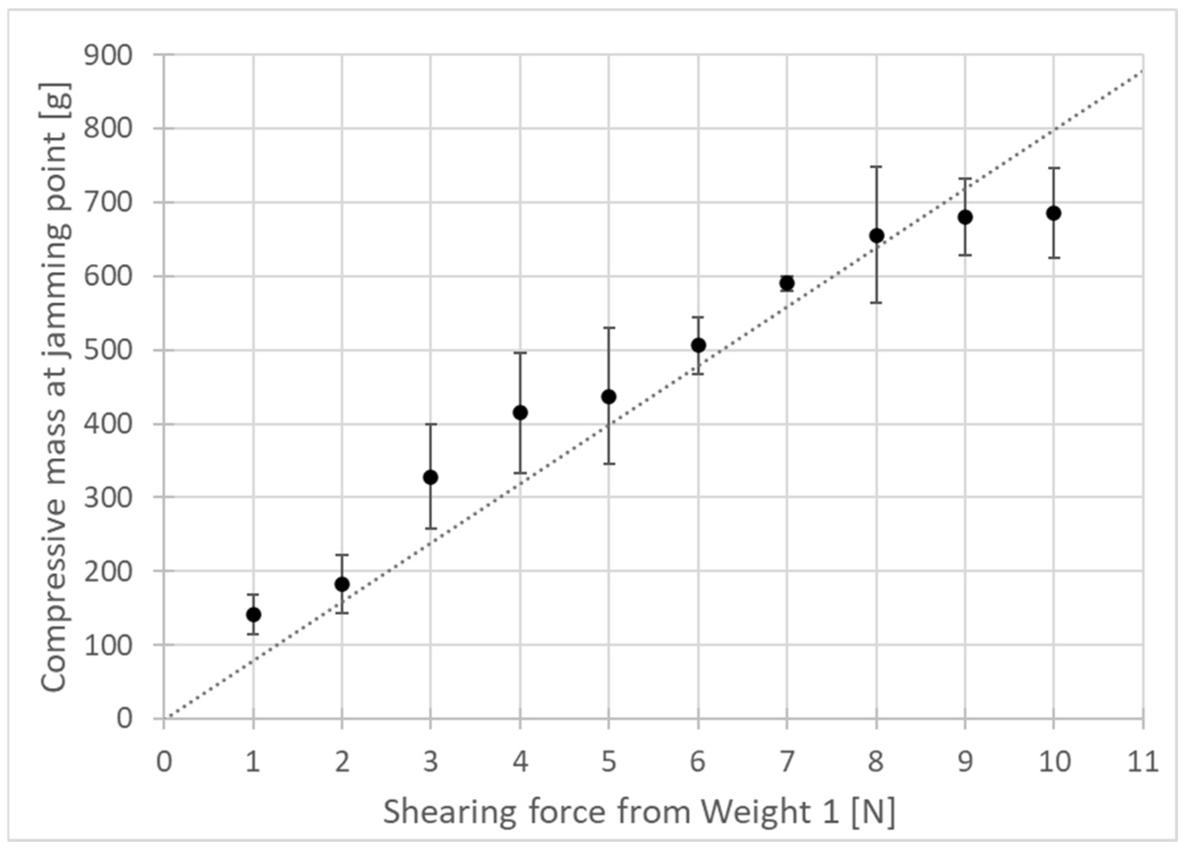 Figure 10 shows plots of the average and standard deviation of the compressive mass at the jamming point for each shearing force. The standard deviation indicates the magnitude of variation in the measurements taken five times for each condition.