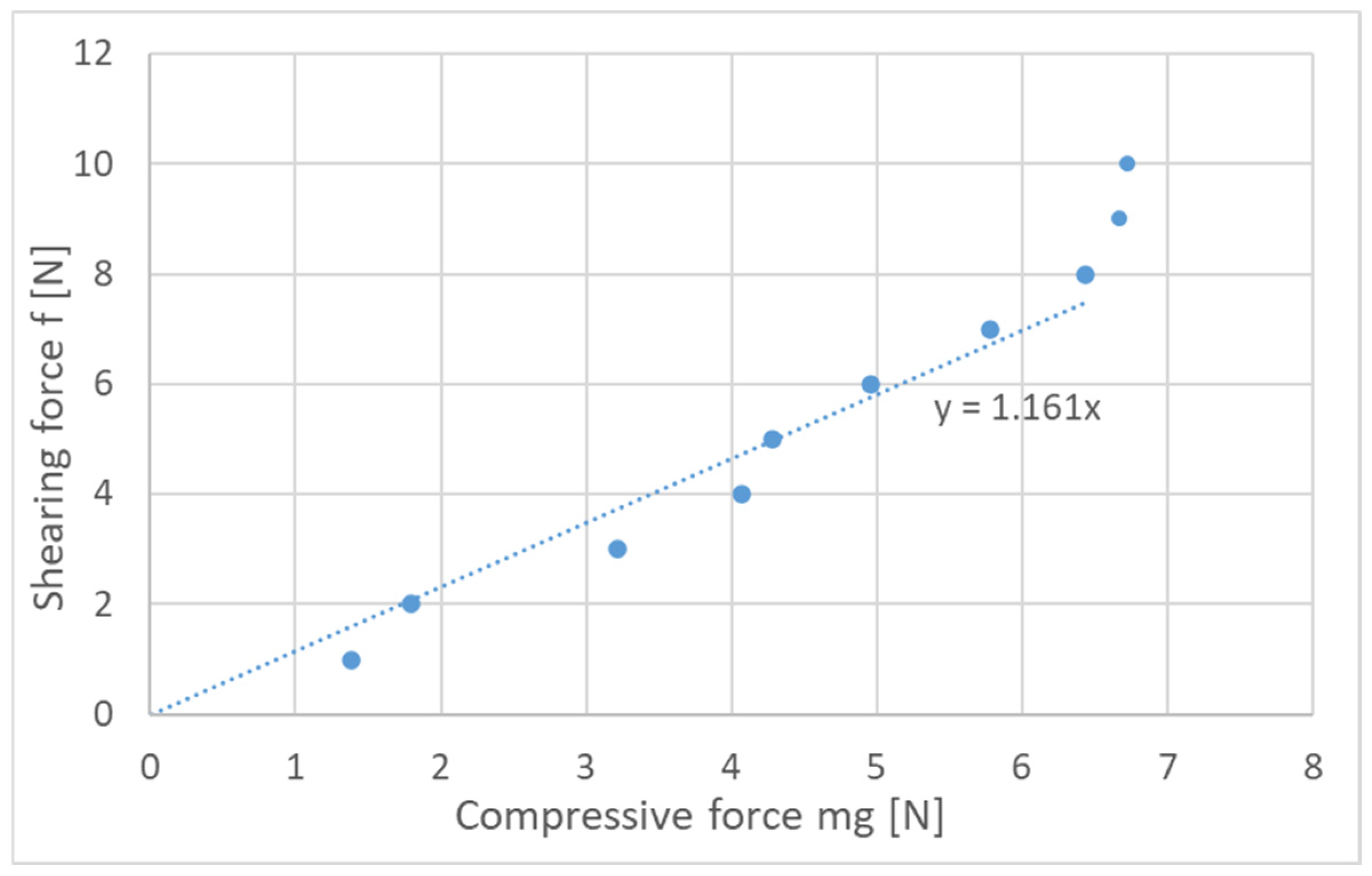 Measurements were continued until the specimen could no longer withstand the shearing force due to the decreasing compressive mass. The magnitude of the shearing force applied by Weight 1 was varied incrementally from 1 to 10 N in 1 N steps, with five measurements performed for each load.