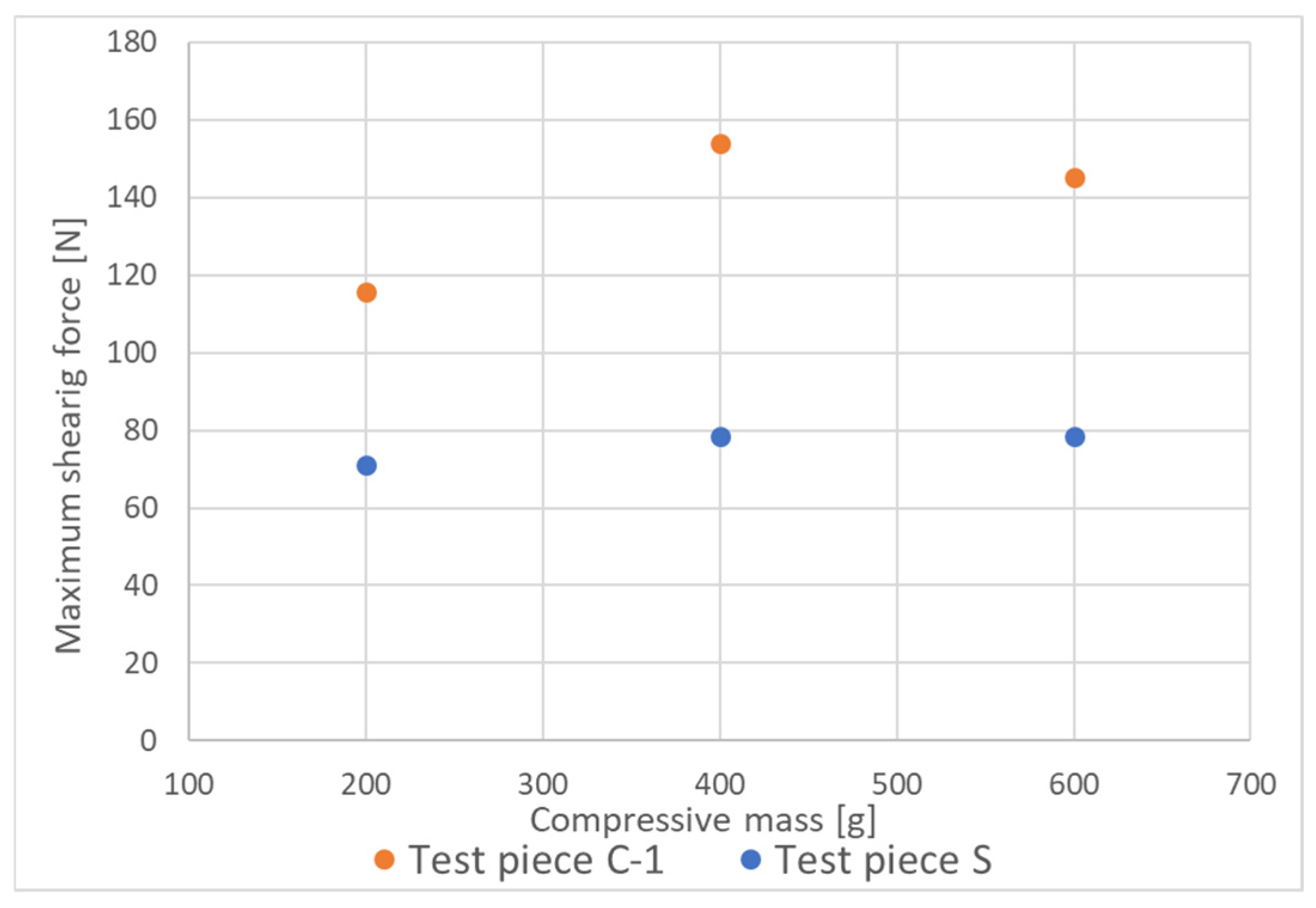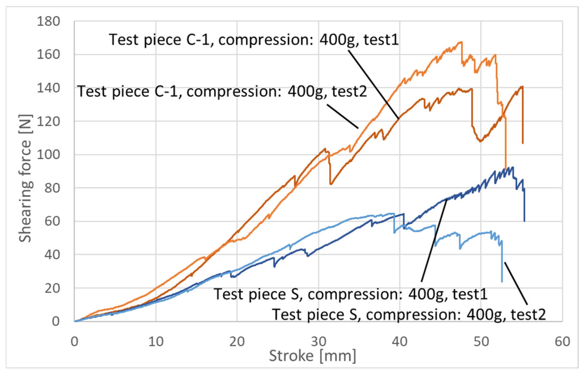 Section 3.1., this experiment used a universal testing machine equipped with a custom-made fixture to apply a shearing force to the specimens and measure the relationship between force and stroke (