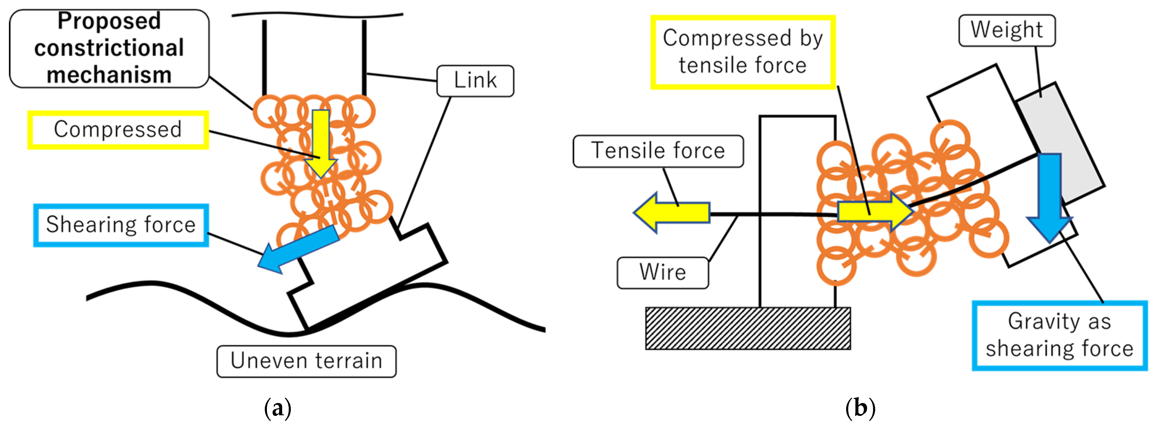 3]. Jamming is a phenomenon in which a structure composed of elements (such as particles, fibers, and layers) imposes geometric constraints between the elements under applied pressure, thereby strengthening frictional coupling and reversibly increasing the structure’s stiffness. Regarding the application of jamming to impart variable stiffness to leg mechanisms, many studies have been conducted using fiber jamming as a tendon mechanism in the leg [