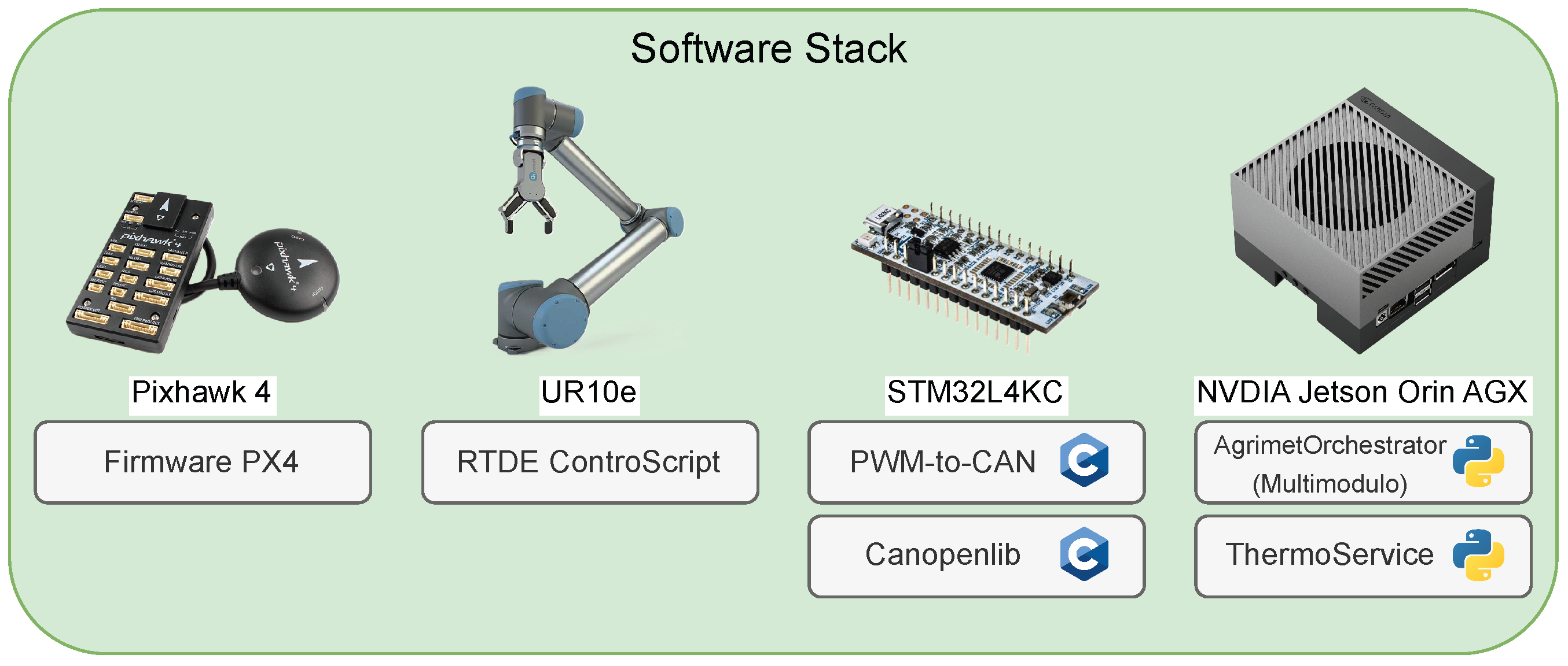 - Both the STM32L4KC microcontroller and the Pixhawk 4 autopilot communicate with the central Jetson Orin AGX processor via serial interface protocols.