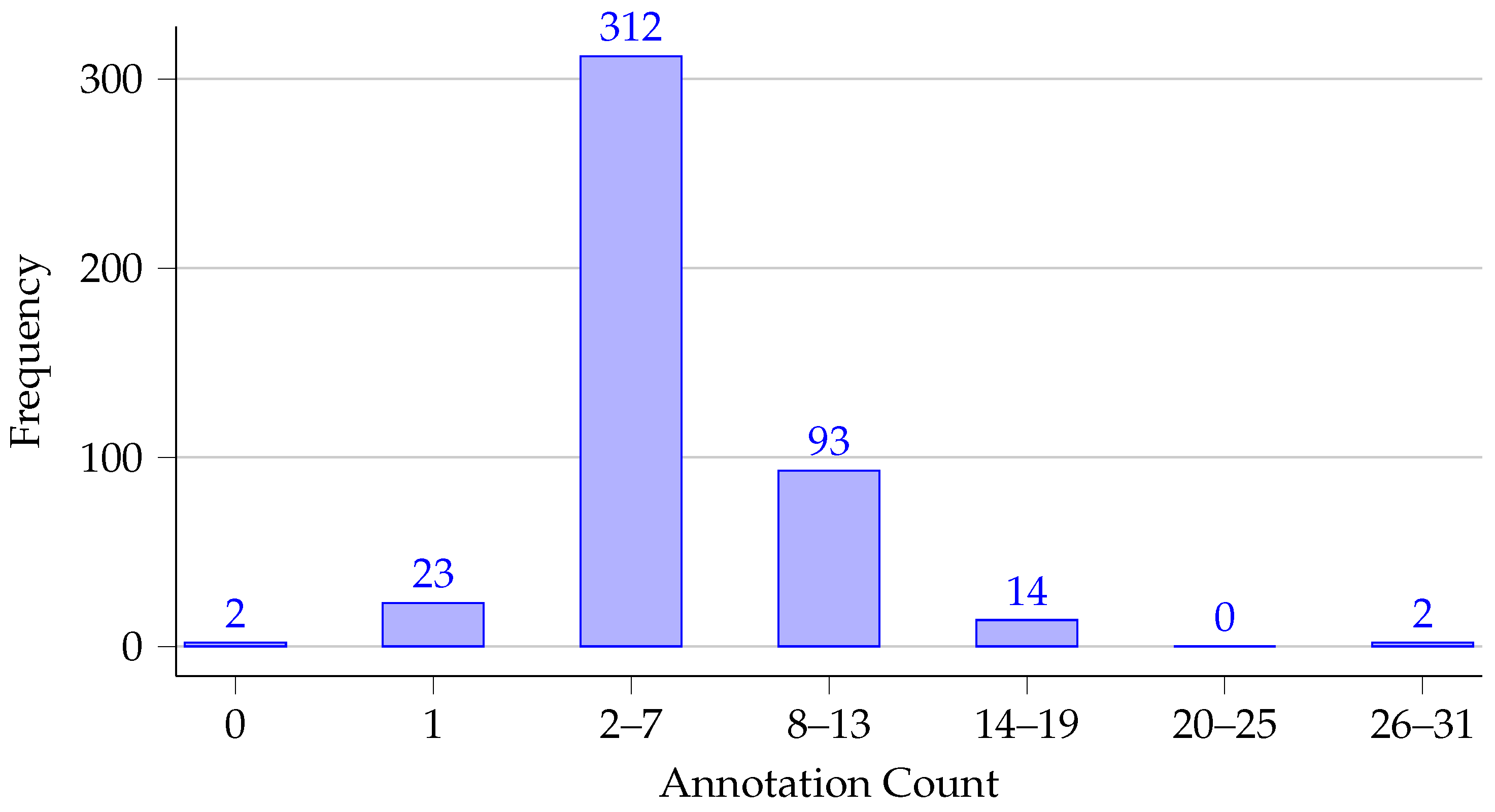 - 2–7 annotations category: In total, 312 occurrences constitute the dataset core with medium-optimal complexity scenes for training.