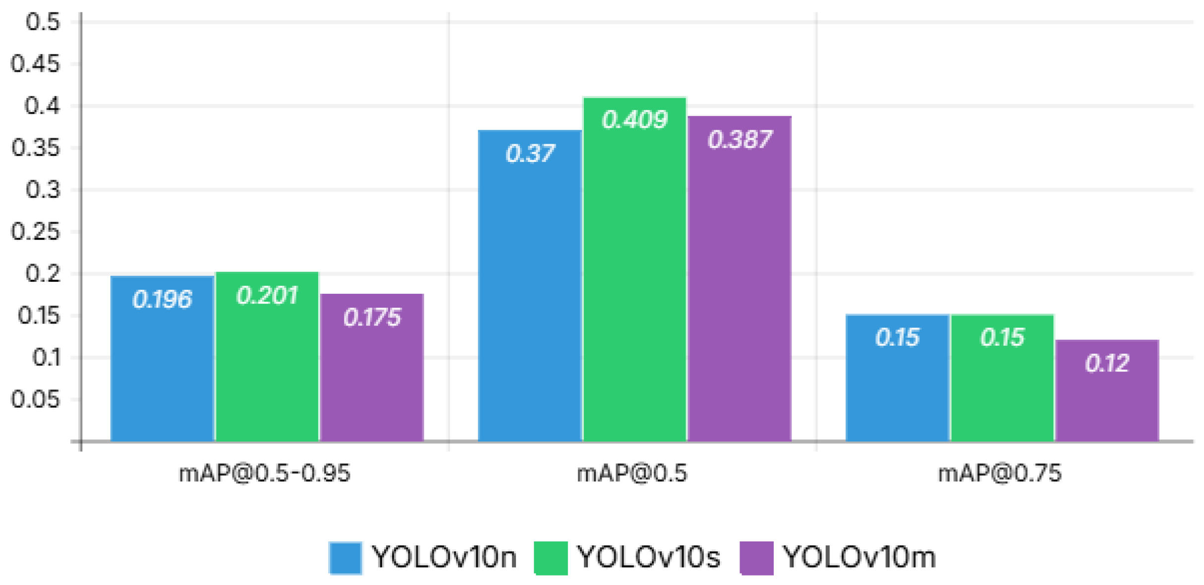 - mAP@0.5-0.95: YOLOv10s emerges with 0.201, followed by YOLOv10n (0.196) and YOLOv10m (0.175). This result indicates superior YOLOv10s performance across a wide range of IoU thresholds, suggesting greater robustness in bounding box localisation.