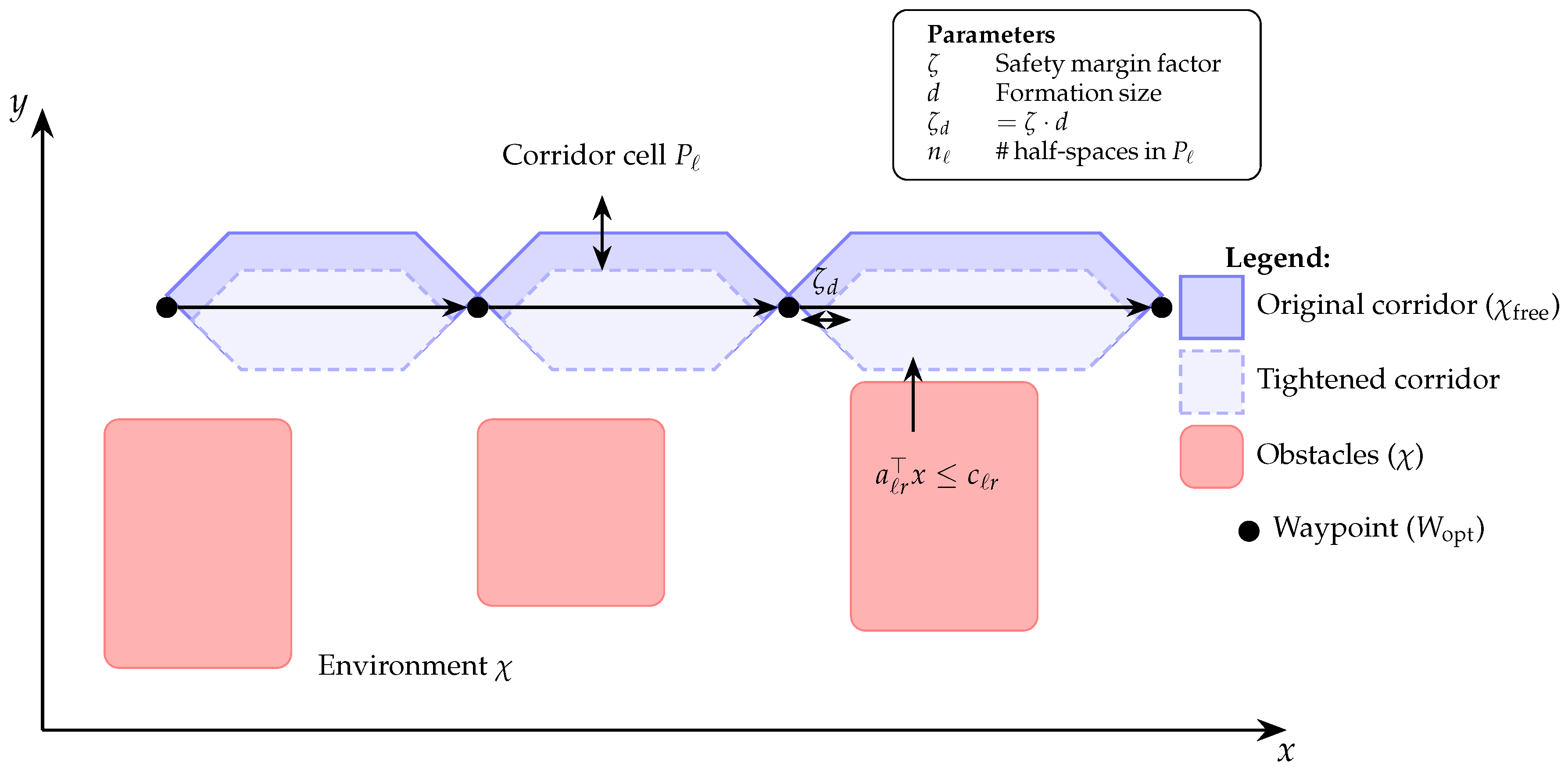 Require: Initial waypoint list , obstacle set , formation diameter d Ensure: Corridor cells 1: Generate initial piecewise linear path 2: for each segment do 3: Compute separating hyperplanes 4: Construct polyhedral cell 5: end for 6: Tighten constraints |