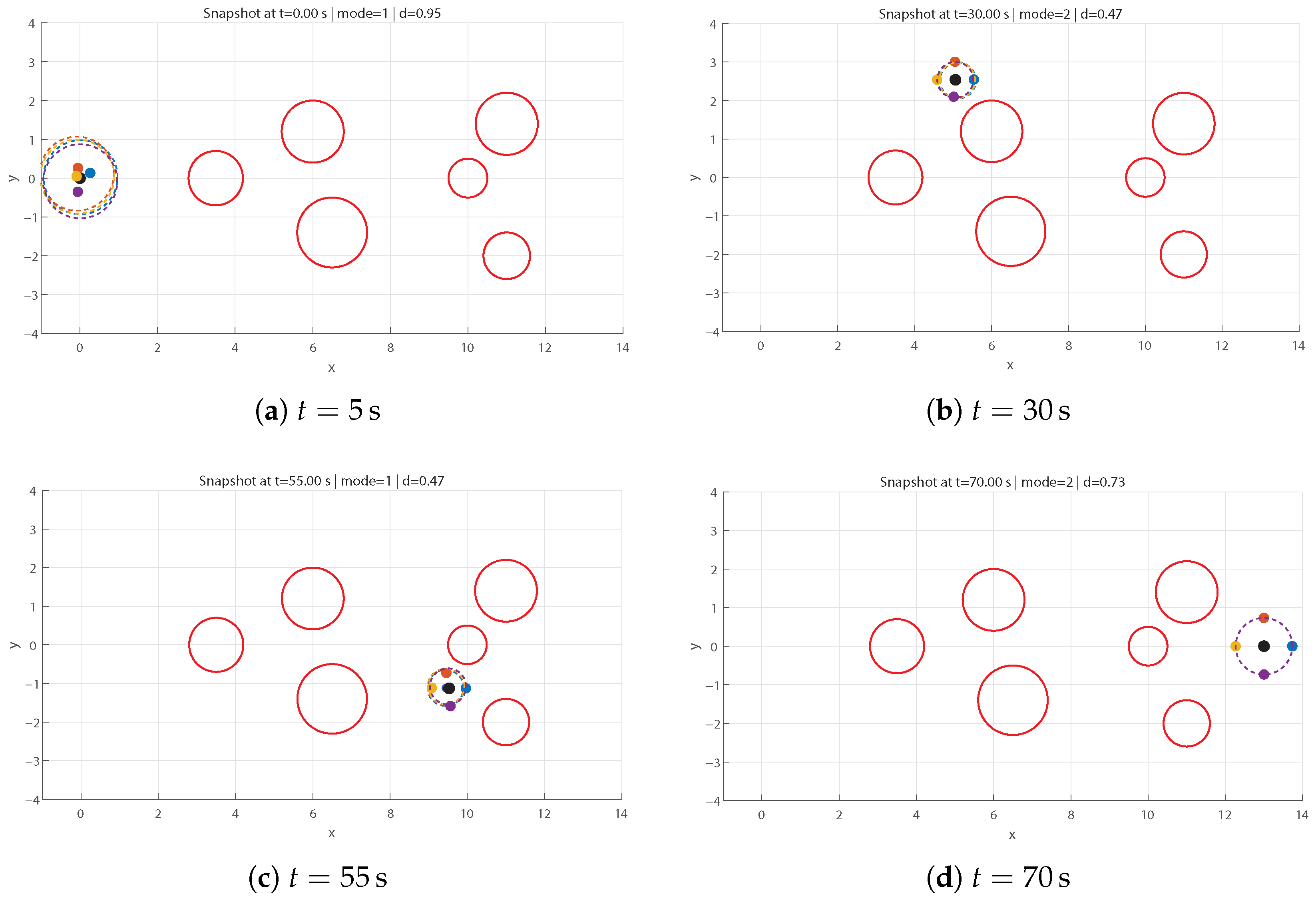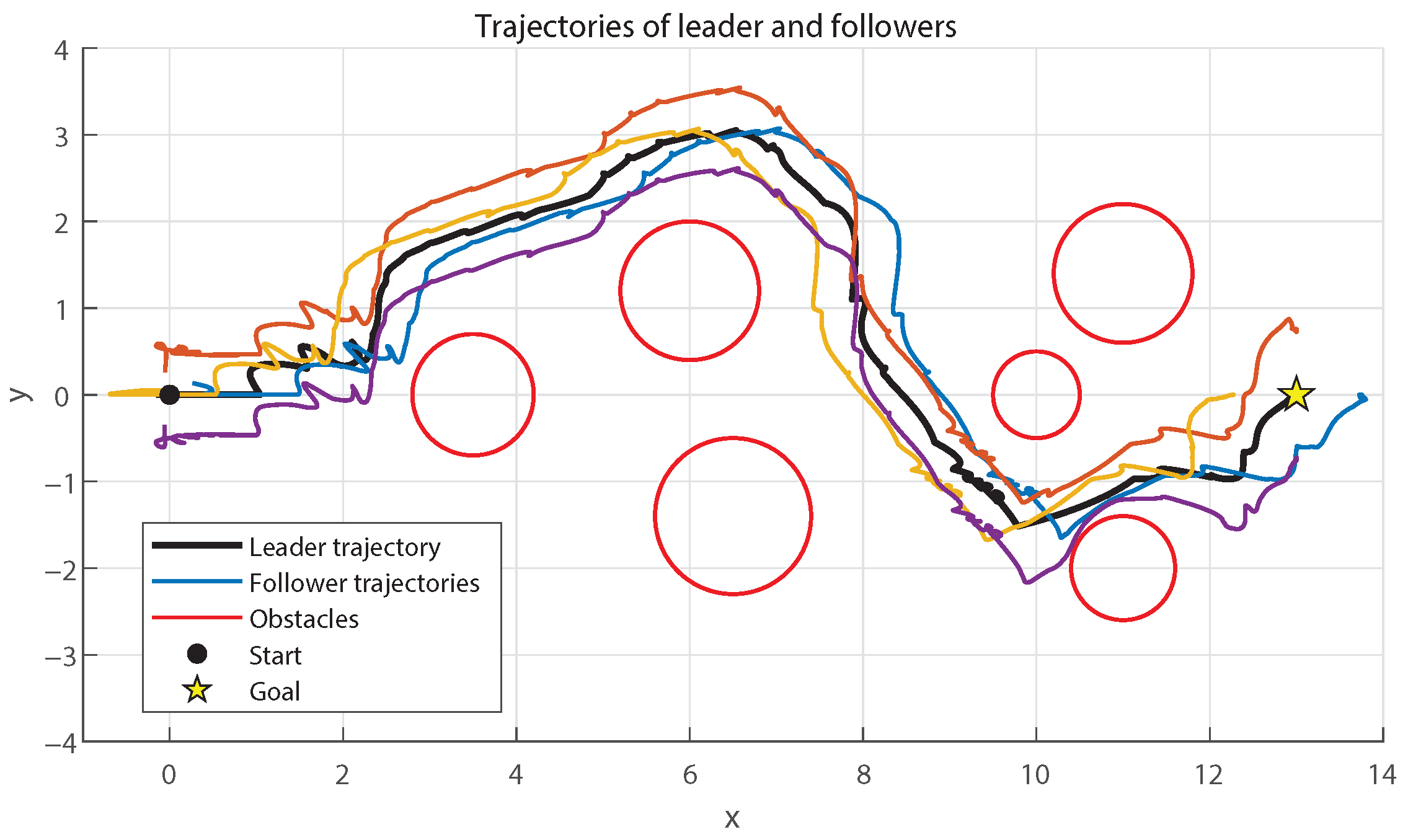 Figure 2 shows the trajectories of the leader and followers. The leader successfully navigates through the cluttered environment and reaches the goal, while followers maintain the desired circular formation. As the team approaches narrow passages, the formation size