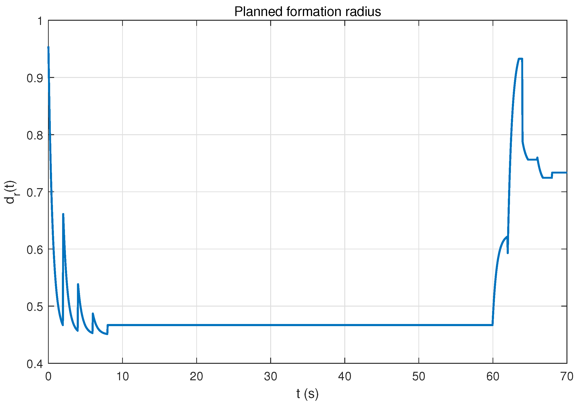 The nominal formation size is and the minimum radius is . The corridor tightening uses the safety factor , so that the corridor constraints are reduced by approximately at each replanning iteration (consistent with the formation footprint). The planned radius is smoothed into using a first-order filter with time constant .