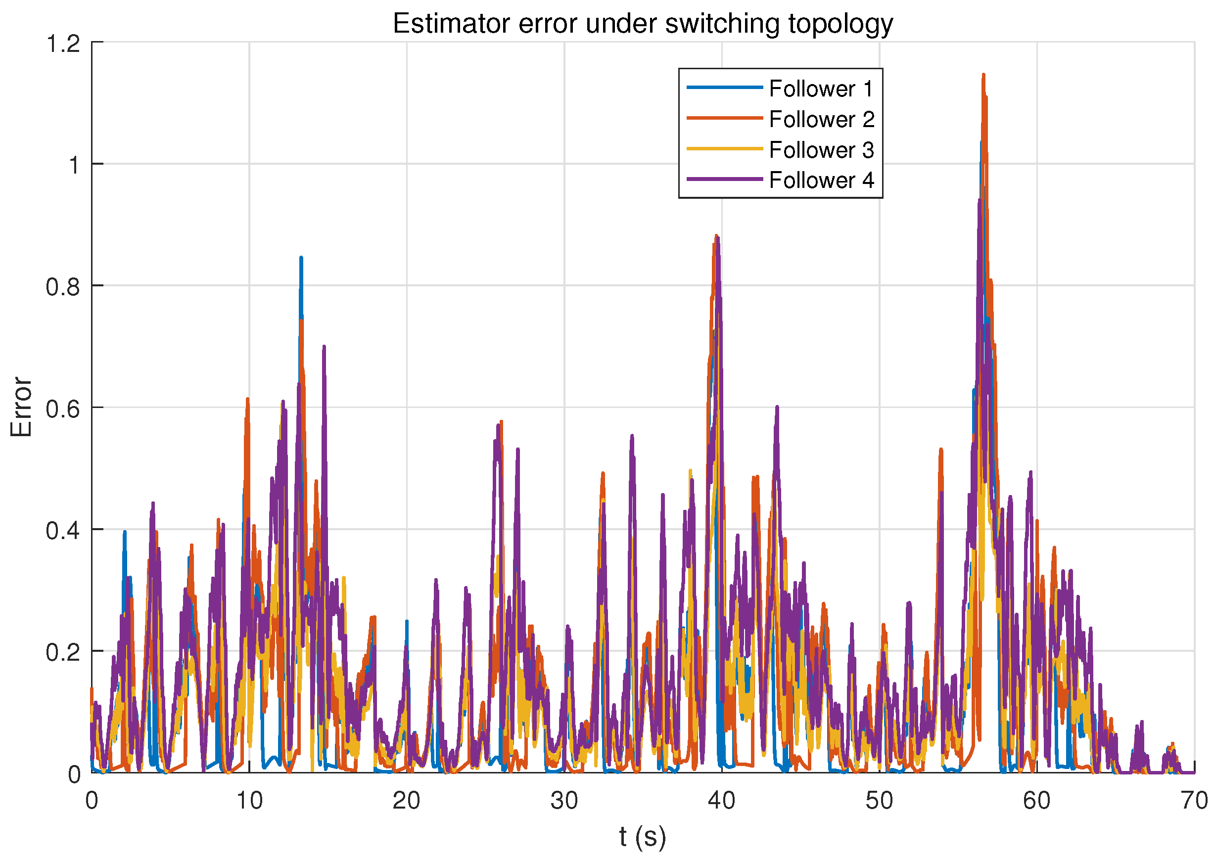 Figure 7 shows a screenshot of the animation depicting the collective motion of the moving bodies in formation. Despite switching directed communication topologies and bounded delays, the estimator errors remain bounded and converge to small neighborhoods of zero, which corroborates the practical agreement guarantee.