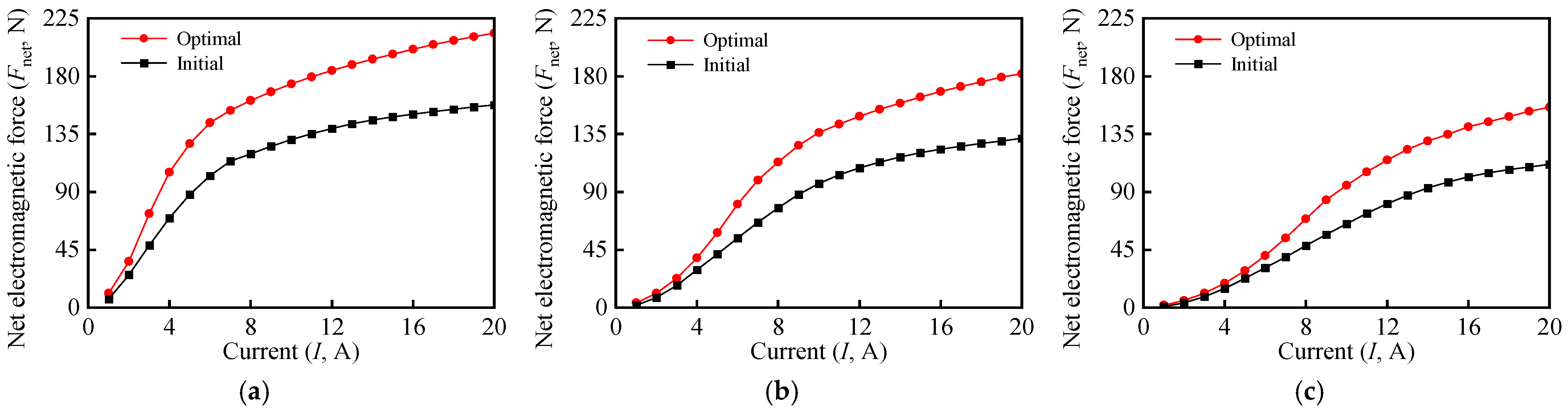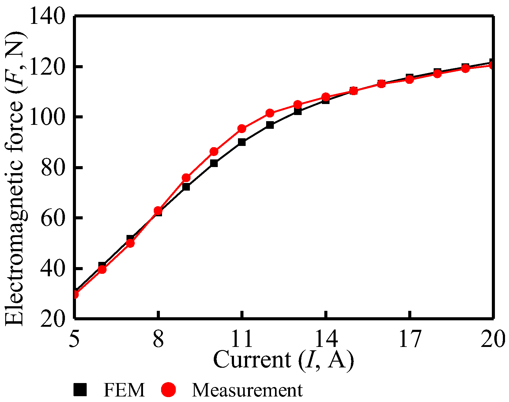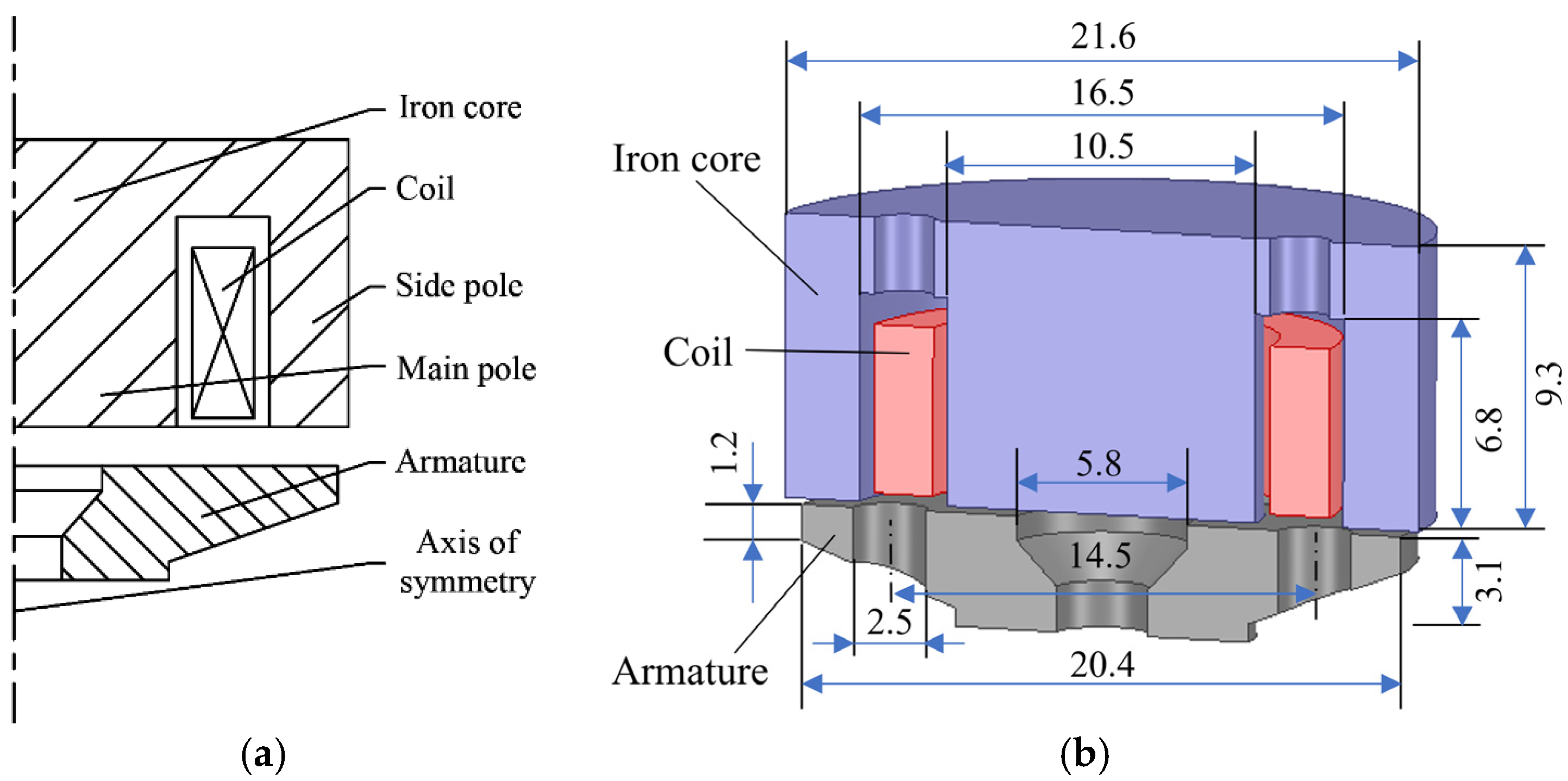 - Liu, P.; Fan, L.; Peng, W.; Ma, X.; Song, E. Design and optimization of novel high-speed electromagnetic actuator for electronic fuel injection system. In WCX™ 17: SAE World Congress Experience; SAE Paper 2017-01-1640; SAE Technical Paper: Warrendale, PA, USA, 2017. [Google Scholar]