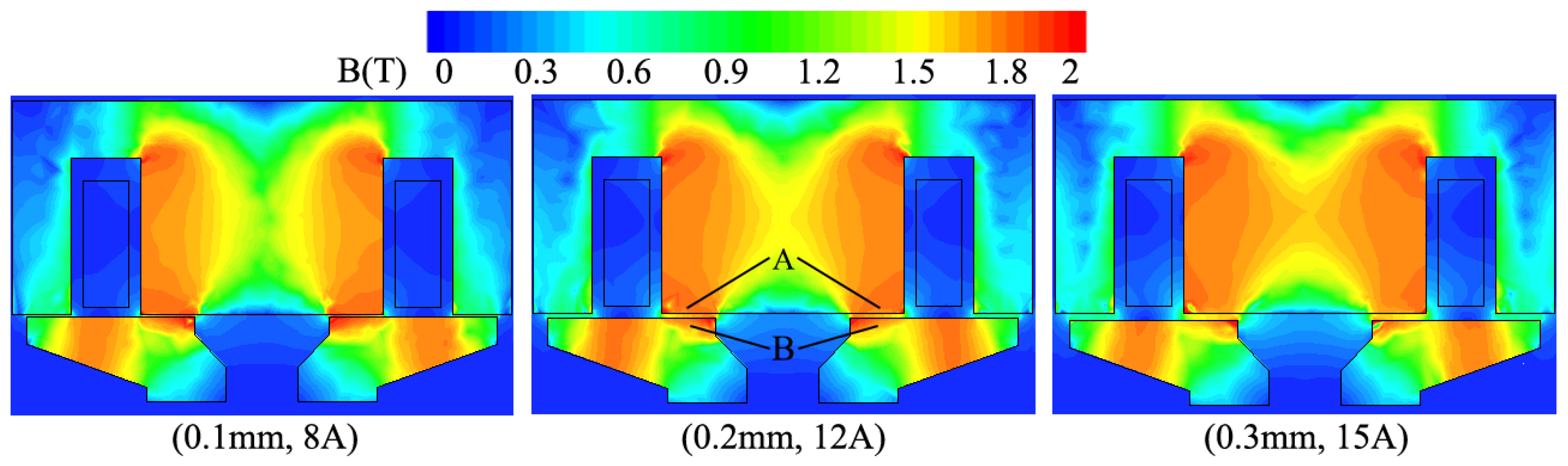 - Lim, S.; Min, S. Design optimization of permanent magnet actuator using multi-phase level-set model. IEEE. Trans. Magn. 2012, 48, 1641–1644. [Google Scholar] [CrossRef]