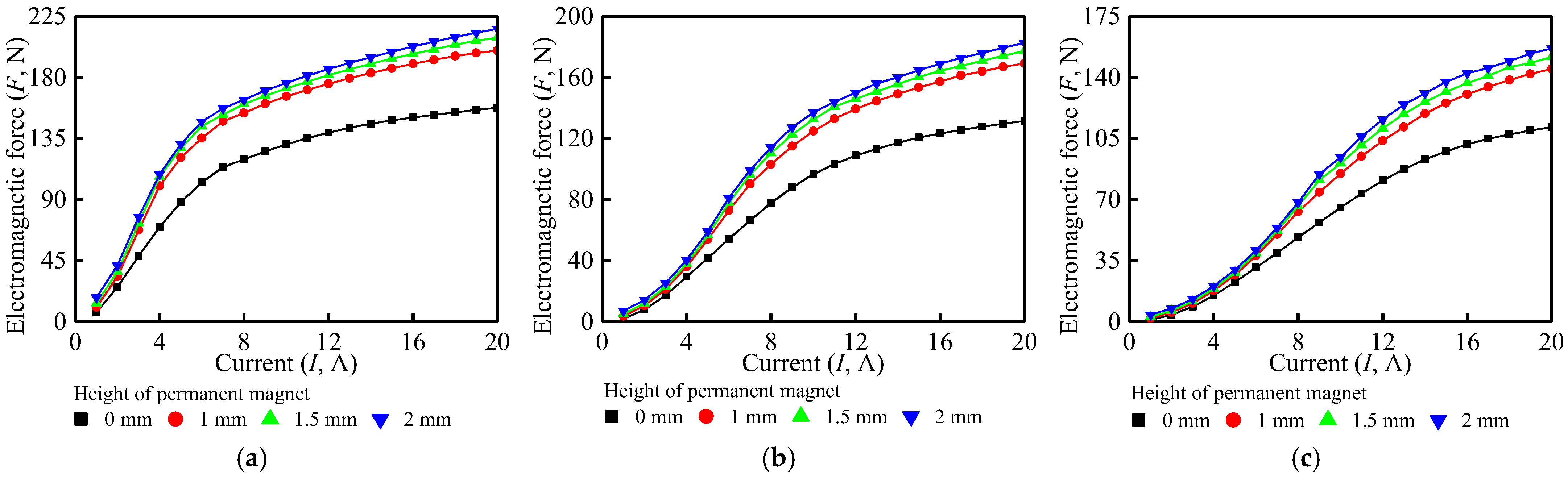 - Kim, J.; Chang, J. A new electromagnetic linear actuator for quick latching. IEEE. Trans. Magn. 2007, 43, 1849–1852. [Google Scholar] [CrossRef]