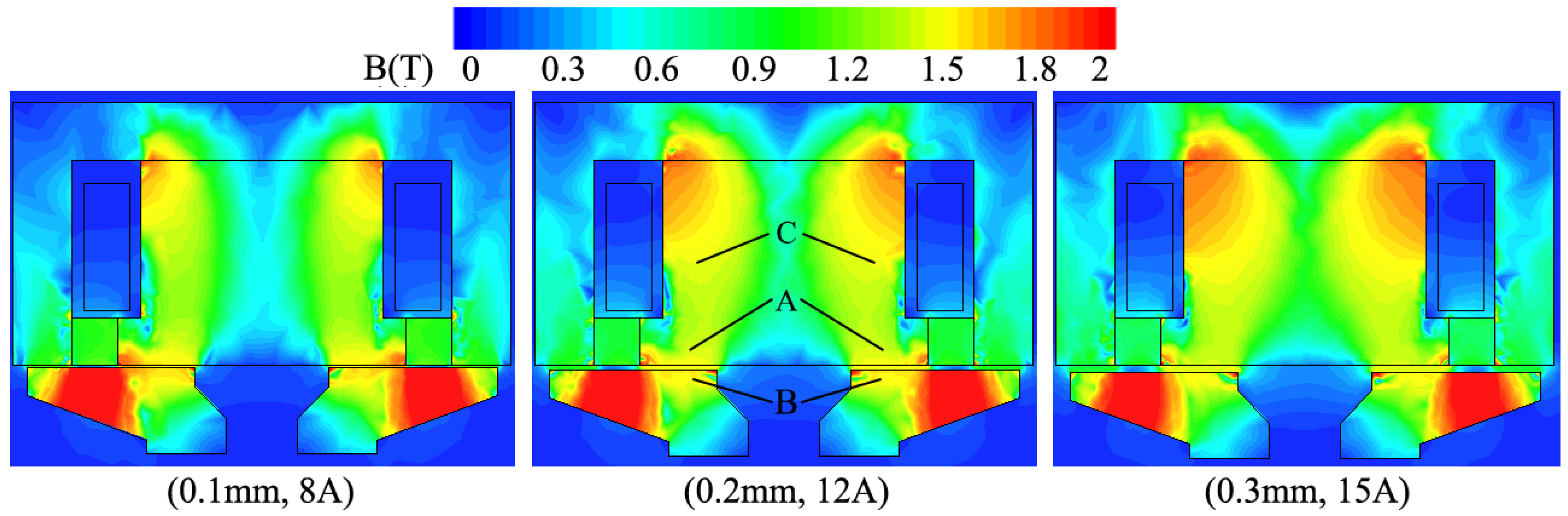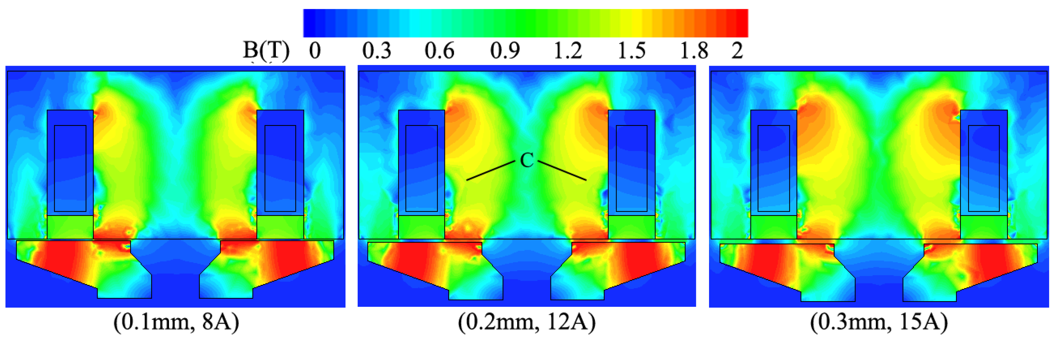 - The electromagnetic energy conversion efficiency and electromagnetic force of an HSS can be further promoted by applying both a PM and an AF structure. They gradually increase with the increase in AF width in a certain range of current, but they will increase at first and then decrease with the increase in AF width when the current exceeds a certain value. In addition, the magnetic saturation in main pole and the armature inside of the HSS can be further weakened by applying both a PM and an AF structure.