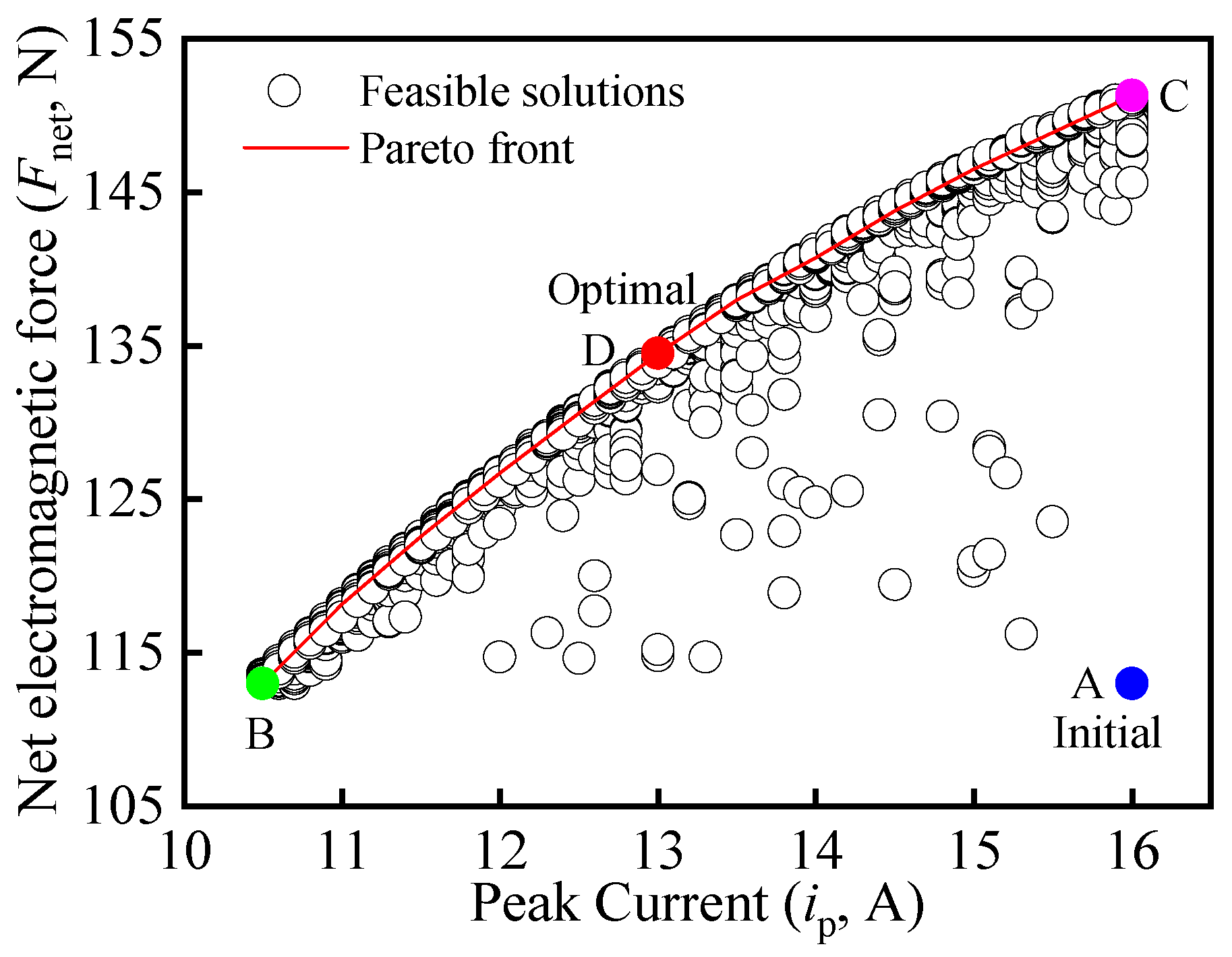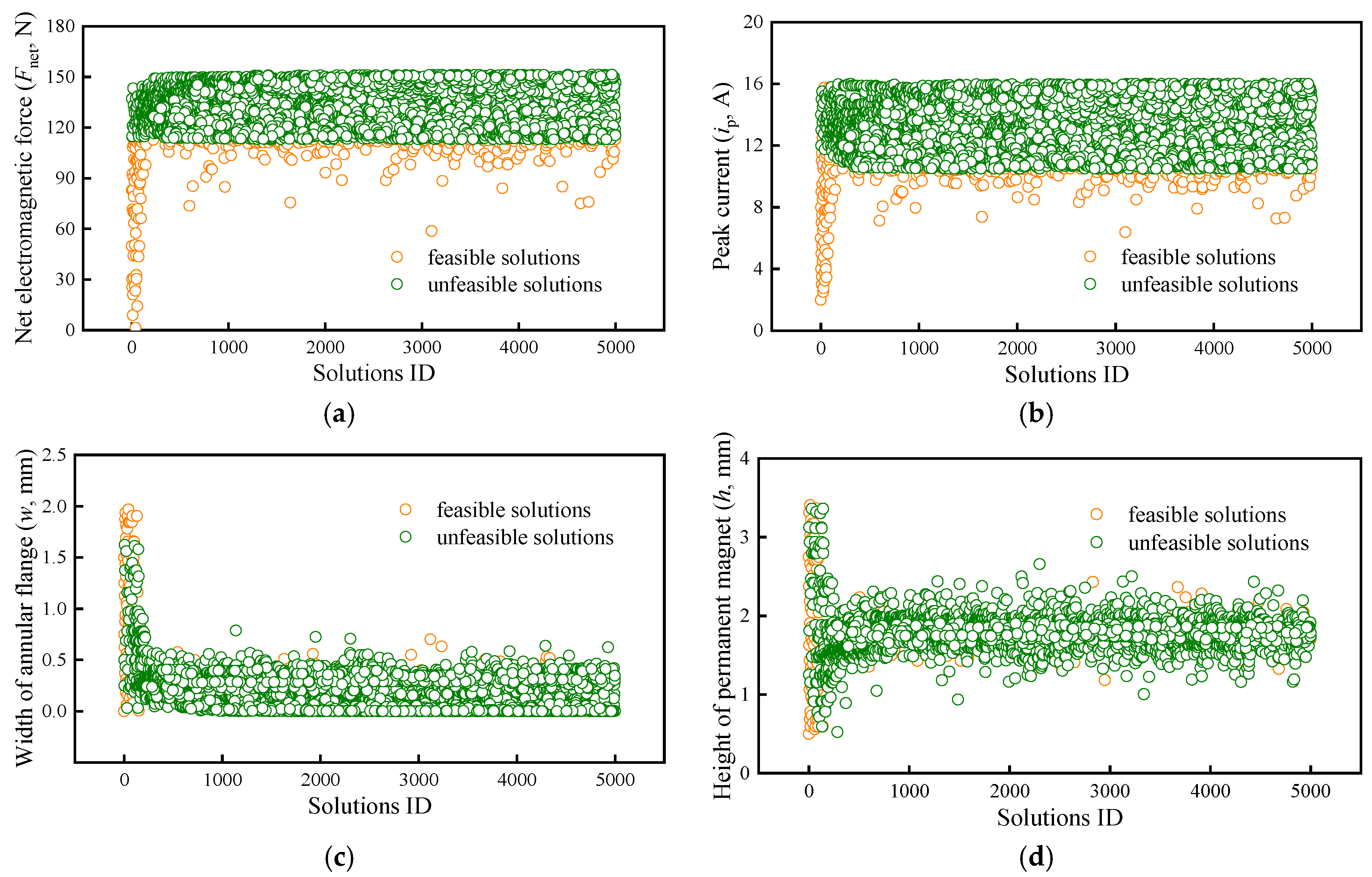 - Liu, P.; Fan, L.; Xu, D.; Ma, X.; Song, E. Multi-objective optimization of high-speed solenoid valve based on response surface and genetic algorithm. In SAE 2015 World Congress & Exhibition; SAE Paper 2015-01-1350; SAE Technical Paper: Warrendale, PA, USA, 2015. [Google Scholar]