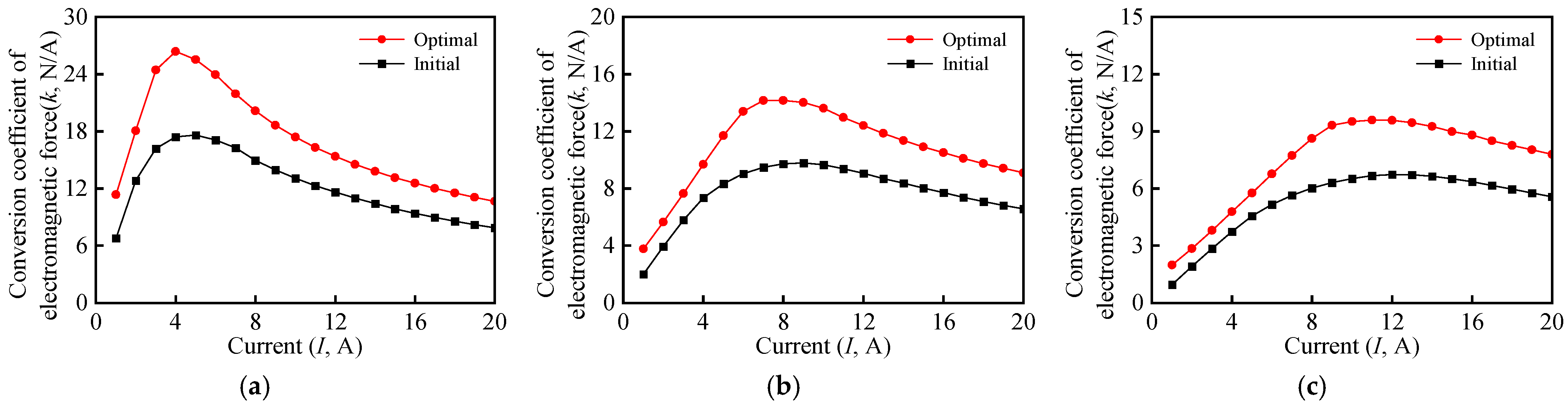 - The multi-objective optimization for the improvement design based on the response surface method and NSGA-II is carried out. The Pareto optimal solution set is obtained and the optimal dimensions of PM height and AF width are determined, for which the NEF strengthens by 18.8% and the peak current decreases by 18.8%, helping with heightening the dynamic response speed of the HSS and lowering its power consumption.
