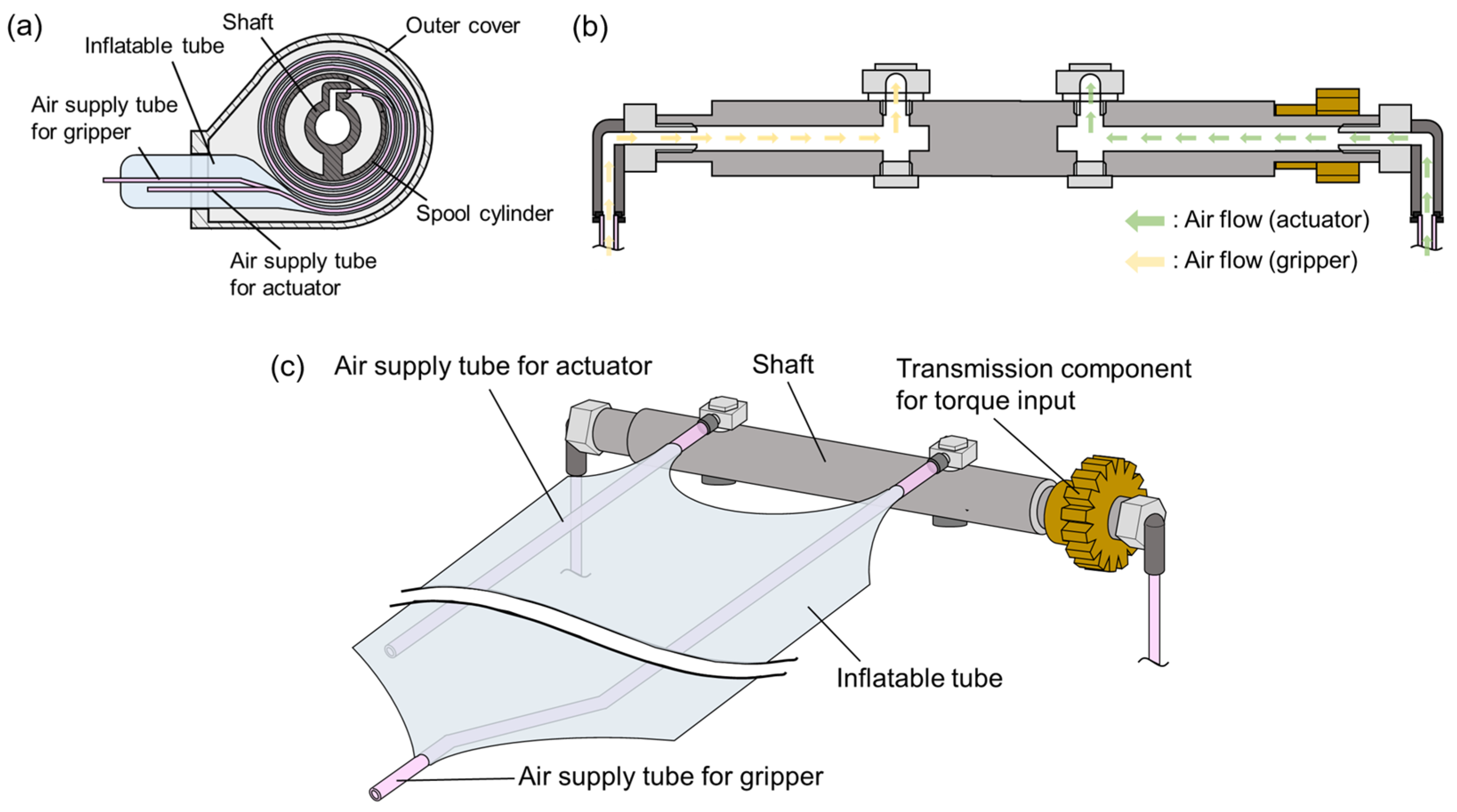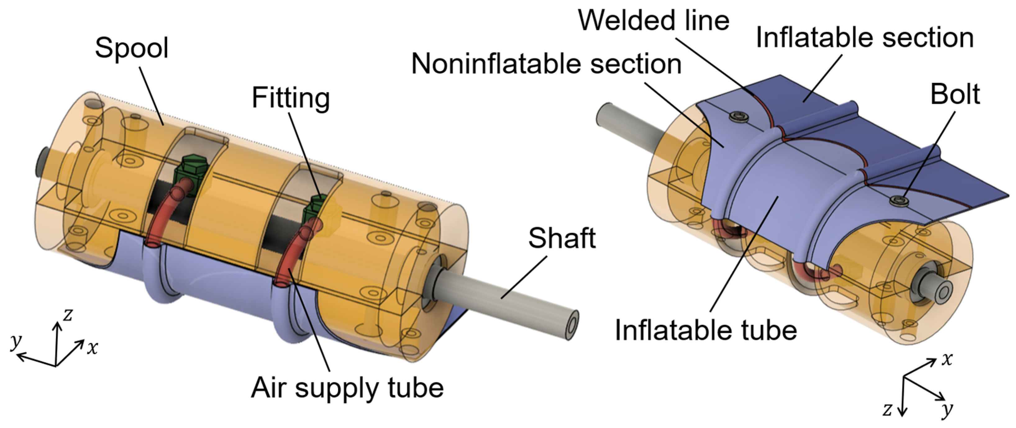 18]. Proposed spool mechanism incorporating air supply tubes within its body is also highly novel and not found in other inflatable robots. This actuator also enables the grasping of objects from a distance by attaching a gripper to its tip. The contraction motion of the actuator enables it to pull itself toward the grasped object, making it a valuable tool for both manipulators and climbing robots.