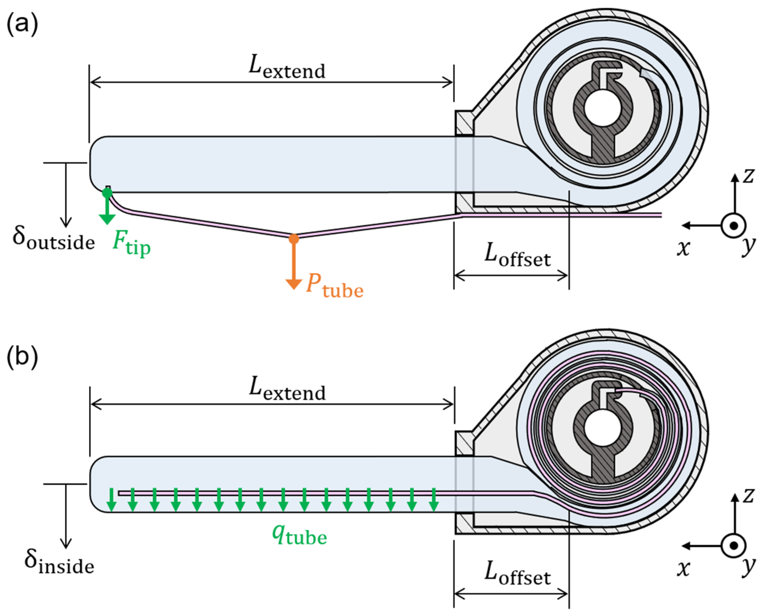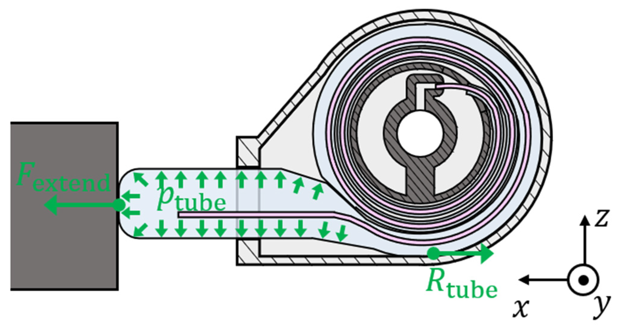 We proposed the model for the extension force, revealing that these forces remain largely unaffected by the length of the tube. The experimental results almost corroborate this finding, demonstrating that the forces are consistent regardless of tube length. This characteristic allows the magnitude of the force to be estimated independent of the state of the actuator, thereby facilitating a more intuitive operation. The extension force when Lextend = 0.9 m was significantly larger than in other cases. In this case, the extension of the inflatable tube did not stop until buckling occurred. This is presumably because the tube length wound on the spool was extremely small, resulting in Rresist being approximately zero. When Rresist = 0 N, the extension force Fextend derived from model (1) is 32 N, 45 N, and 57 N for internal pressures of 10 kPa, 14 kPa, and 18 kPa, respectively. Comparing these values with the experimental results, the results at 10 kPa are close to the theoretical values. In addition, the buckling loads Fcr derived using model (3) are 43 N, 42 N, and 41 N for internal pressures of 10 kPa, 14 kPa, and 18 kPa, respectively. Comparing Fcr and Fextend, Fcr is smaller for internal pressure of 14 kPa and 18 kPa. Therefore, the tube was presumed to have buckled before Fextend reached its theoretical value. Hence, unless the actuator is used near its maximum length, the extension force can be estimated from the proposed models. The Rresist used in the extension force model (1) is determined experimentally. Since Rtube consists of the frictional force occurring between the inflatable tube and the outer cover, and the force required for the bending deformation of the tube, Rresist changes when the actuator size changes. For example, when the curvature of the tube inflated inside the outer cover becomes smaller, the Rresist increases because the tube requires a larger bending. If a model for estimating Rresist under various conditions is successfully developed, we believe that the utility of the proposed actuator is significantly improved.