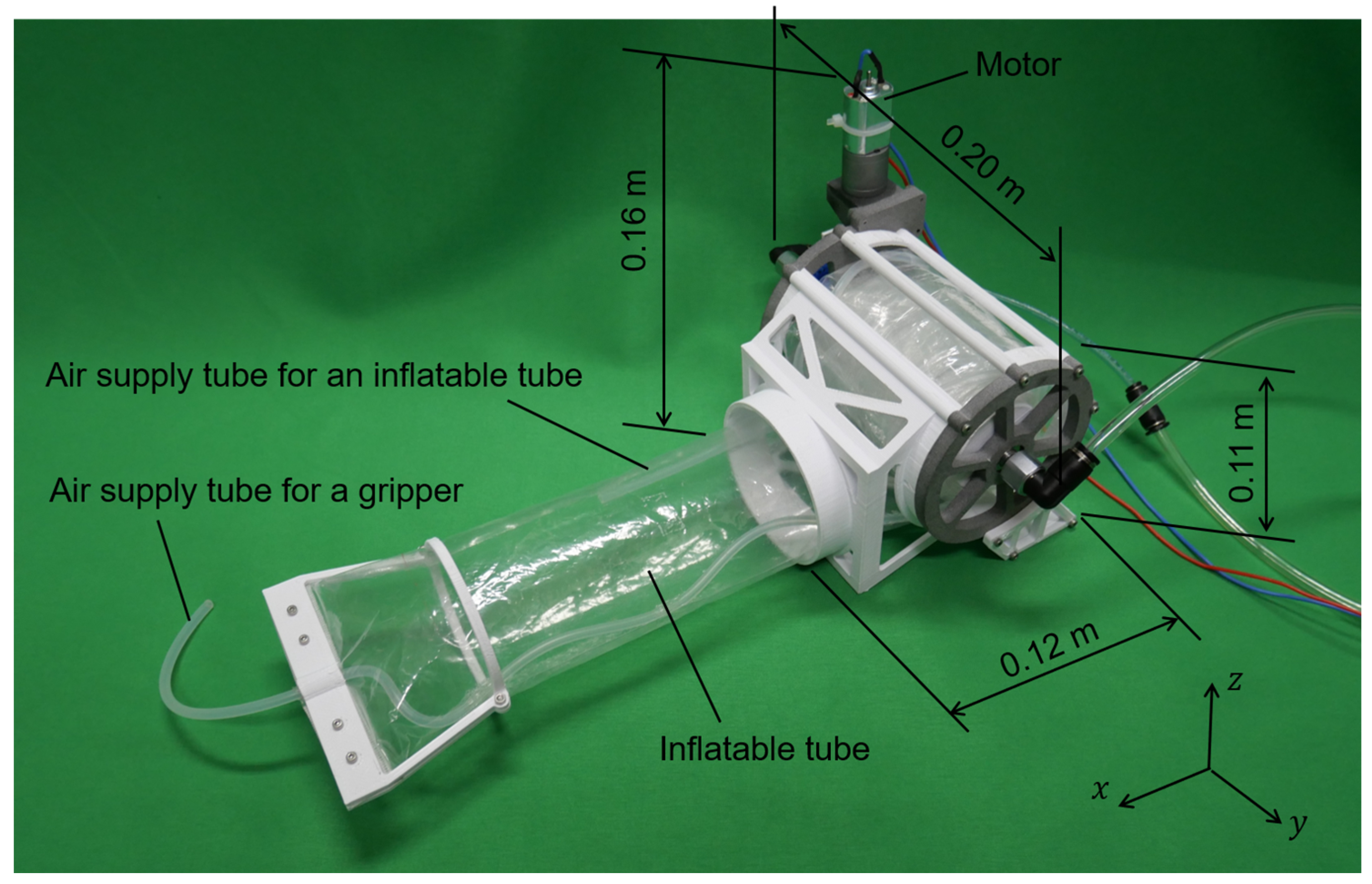 The length of the fabricated actuator with outer cover was 0.12 m, and the length of the mounted inflatable tube was 1.1 m. Therefore, the strain of the fabricated actuator considering the offset length