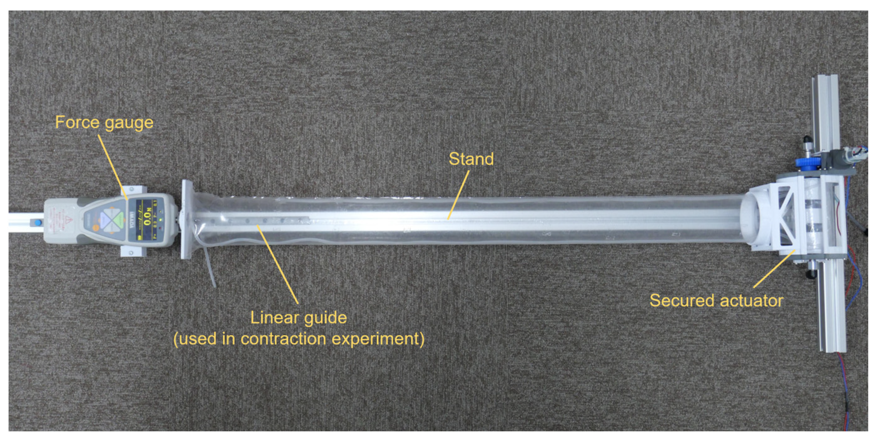 Fextend was conducted. The actuator was secured to the stand constructed from an aluminum frame. The actuator was supplied with 10 kPa of air, and the tube was extended by 0.20 m. The force gauge was positioned so that the tip of the gauge and that of the tube made contact. Subsequently, the actuator was slightly contracted. After that, the actuator was extended, and the maximum extension force
