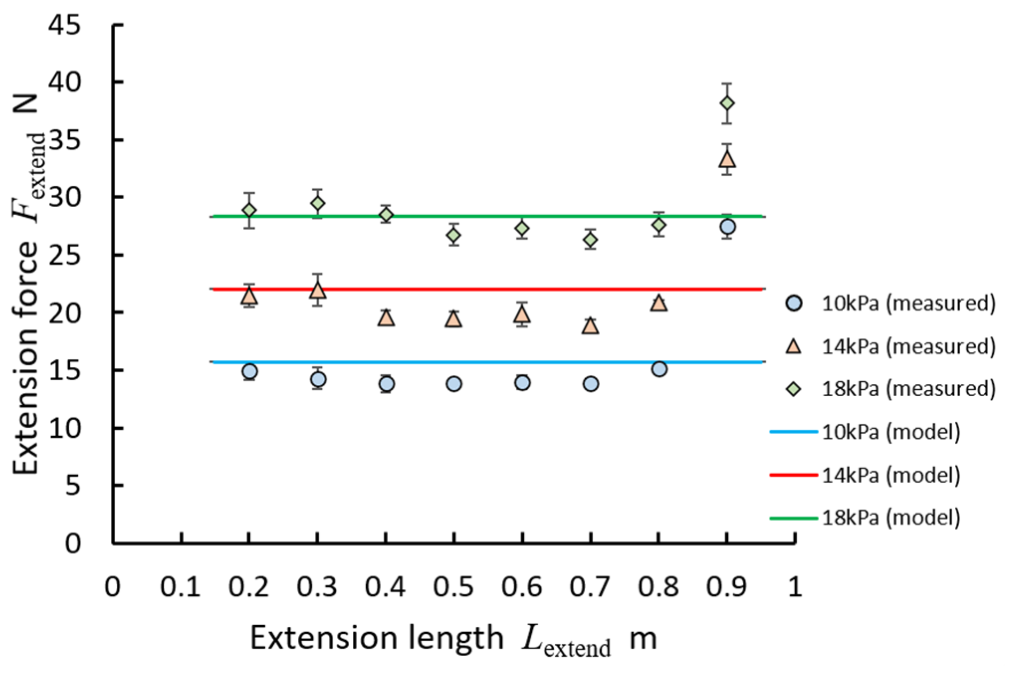 Figure 11. The extension forces were almost identical regardless of the tube length from 0.20 to 0.80 m. The theoretical values of the extension force obtained from these results and models (1) and (2) are represented by solid lines in the figure. The extension forces were increased significantly at 0.9 m. When the length was 0.80 m or less, the actuator halted extension due to resistance. On the other hand, when the length was 0.90 m, the inflatable tube was buckled. The average lengths of the inflatable tubes when buckling occurred at pressures of 10 kPa, 14 kPa, and 18 kPa were 0.97 m, 0.98 m, and 1.00 m, respectively.