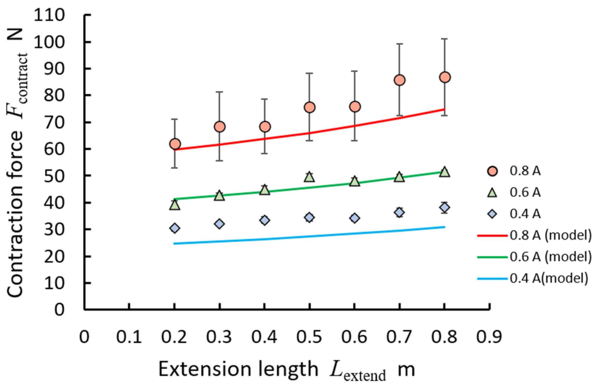 An experiment was conducted to evaluate the contraction force acting on the fabricated actuator. Initially, the inflatable tube was completely exhausted, and the actuator was fixed to a stand. The tube length Lextend was set to 0.20 m, and the tip of the tube was connected to a force gauge. Subsequently, the actuator contracted, and the maximum contraction force Fcontract was measured. The tube length was varied from 0.20 to 0.80 m in increments of 0.10 m, with upper current limits set to 0.4, 0.6, and 0.8 A. The measurements were repeated six times under each condition.