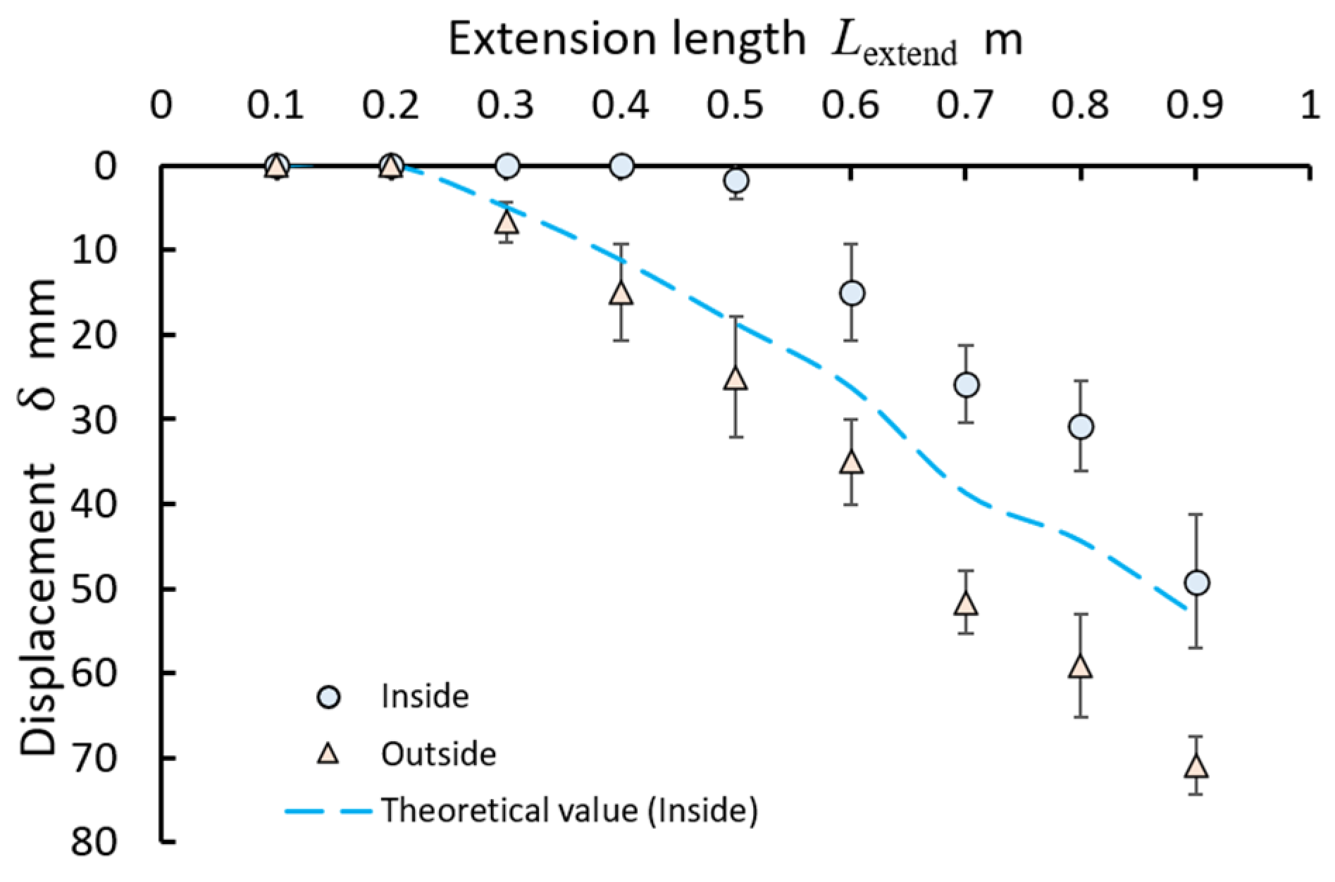Lextend increased. The inflatable tube, with the air supply tube connected outside, exhibited greater displacement than that with the air supply tube fixed inside. The broken line represents