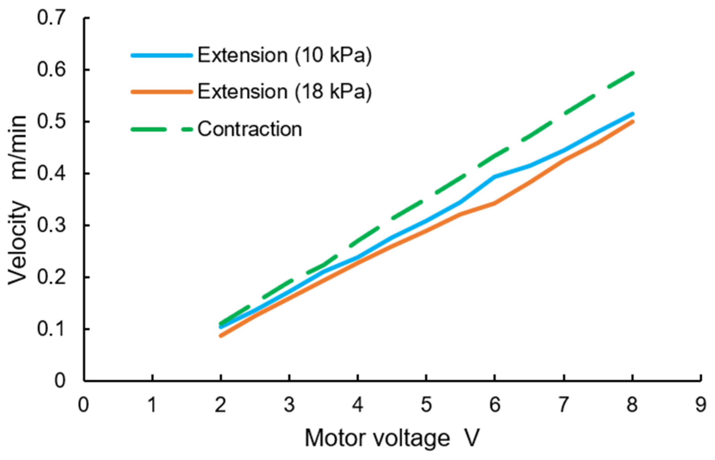 Figure 14. The speed increased as input voltage increased. Under the same input voltage conditions, the contraction motion exhibited the highest speed, while the extension motion at 18 kPa exhibited the lowest speed.