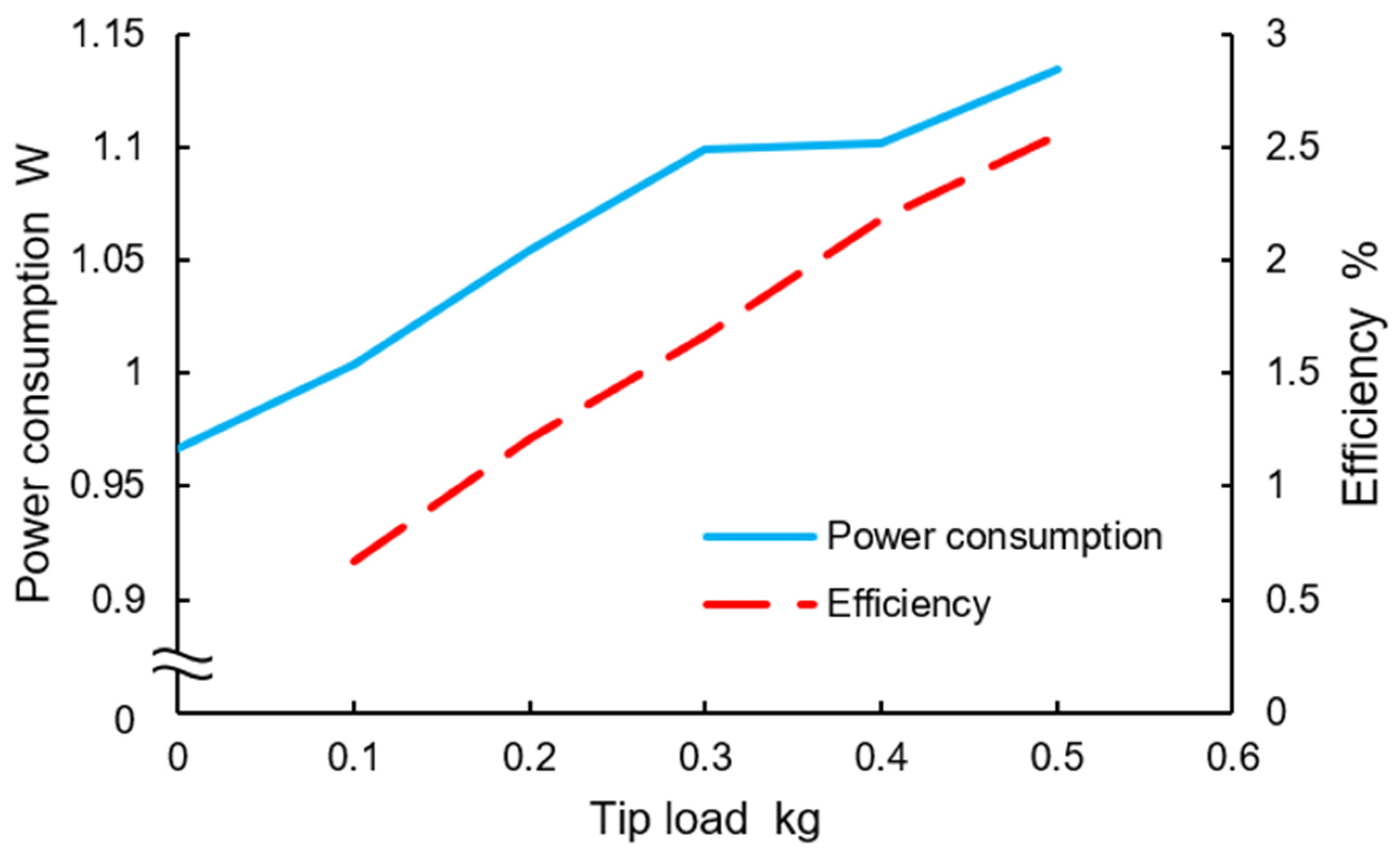 Figure 16. The electrical power consumption increased as tip load increased. The efficiency also increased as tip load increased.