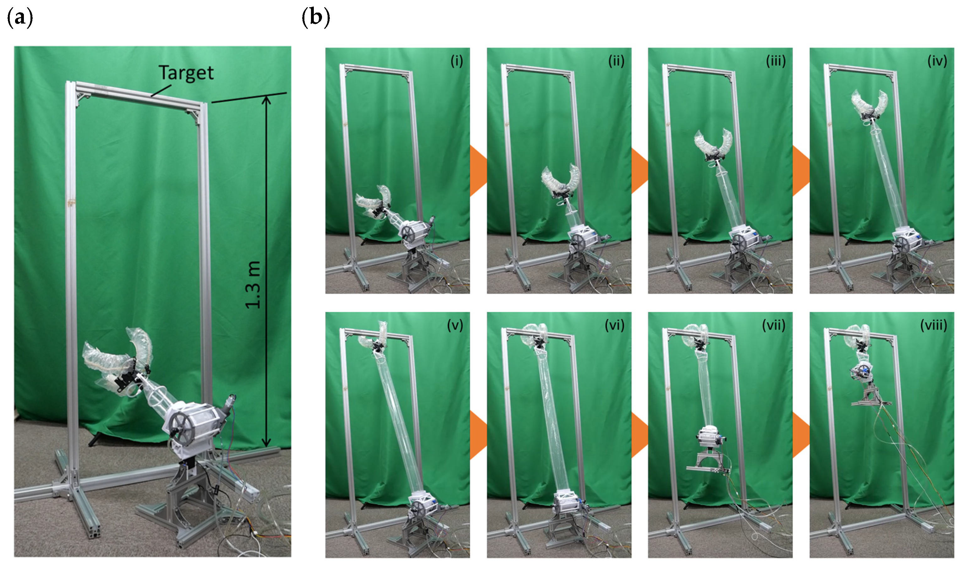 In the demonstration, we successfully executed a sequence of motions for controlling the extension direction, extension, grasping, and contraction. This indicates that the proposed actuator can provide the required motions for one arm of a bi-arm climbing robot. Notably, the proposed actuator offers the advantage of being able to stop extending and contracting at any time, as well as the ability to contract with significant force, distinguishing it from other actuators. Although its mass is larger than those of other inflatable actuators [