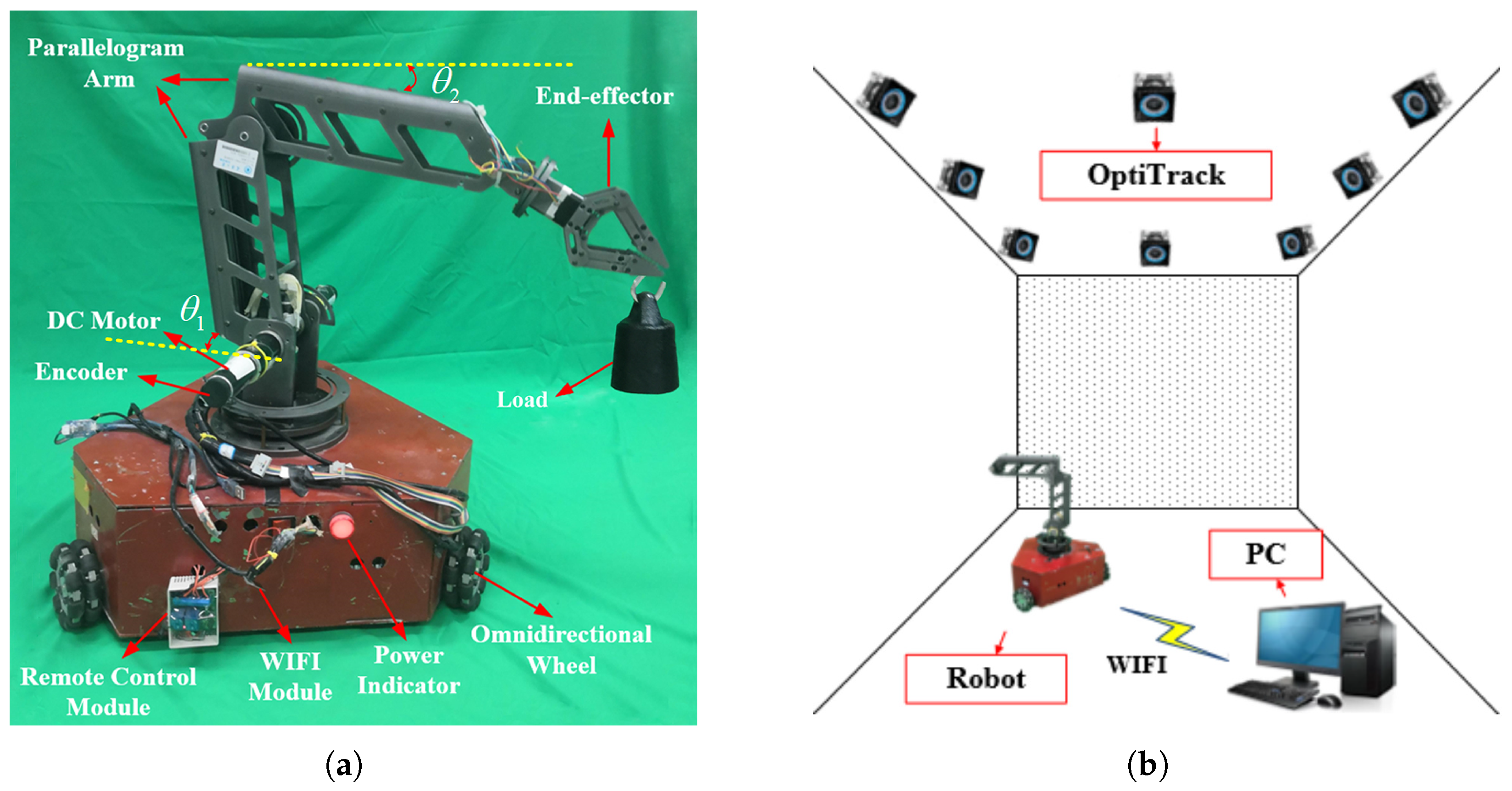 - Xu, D.; Zhao, D.; Yi, J.; Tan, X. Trajectory tracking control of omnidirectional wheeled mobile manipulators: Robust neural network-based sliding mode approach. IEEE Trans. Syst. Man Cybern. Syst. 2009, 39, 788–799. [Google Scholar]
