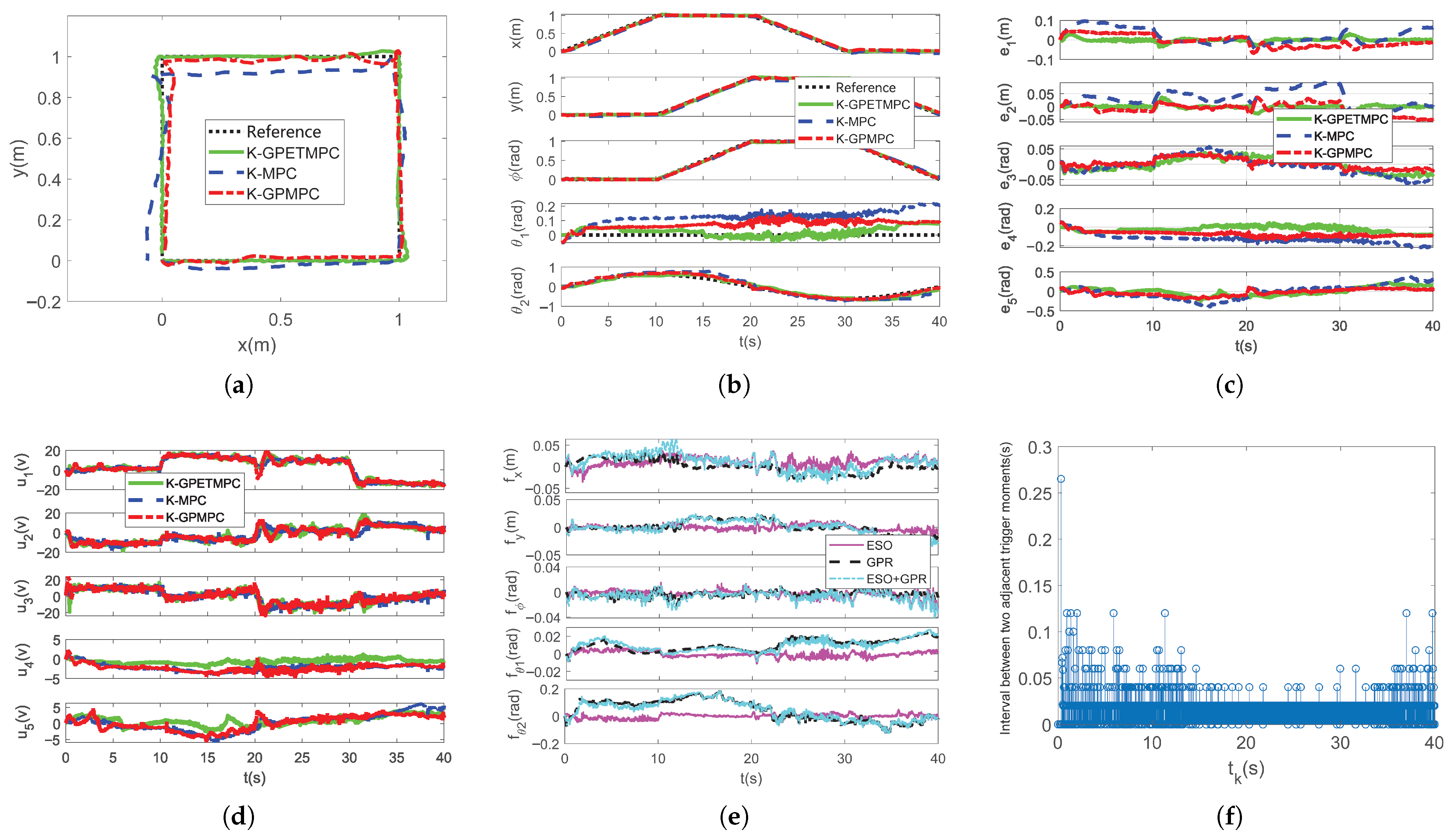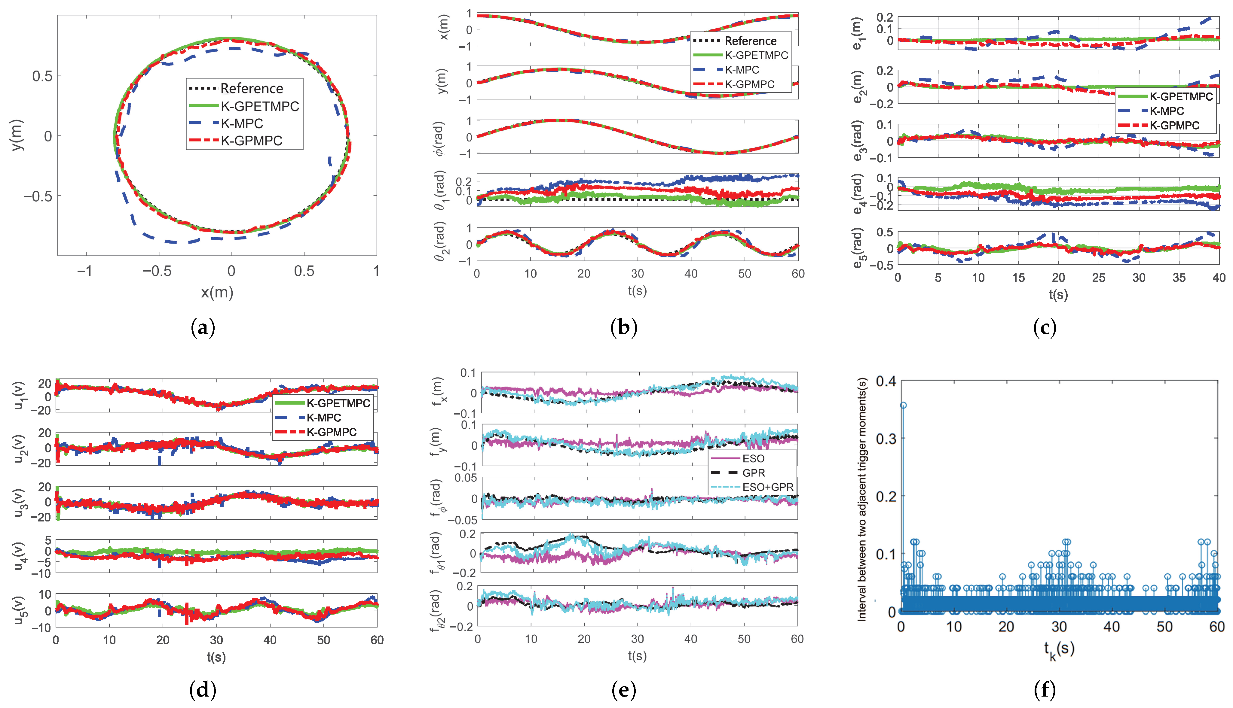 - If the event-triggering conditions are not satisfied, the time instant is set as , where n is a constant and T represents the sampling period. In this case, the MPC, GPR and ESO remain dormant, and the control signal is defined as follows: