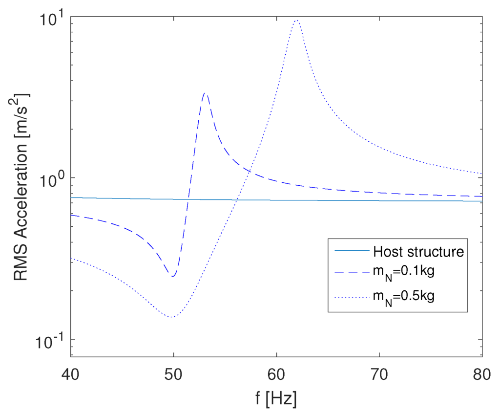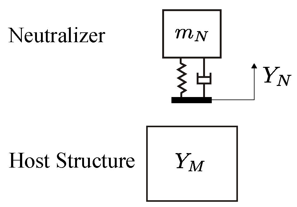 Obviously, the neutralizer causes two conjugate complex zeros in the resulting admittance, but also an additional pair of poles. A simple example with a mass of representing the host structure and an excitation force of illustrates the resulting admittance characteristics (Figure 2). For a neutralizer of tuned to , a significant drop in the vibration amplitude at the resonance is observed, but also a peak at about . If the excitation frequency were to increase above towards this frequency, the neutralizer would cause a deterioration of the vibrations. If a much larger neutralizer mass of is used, the bandwidth of vibration reduction is increased; however, in most practical problems, it is not possible to add another 50% to the host’s mass.