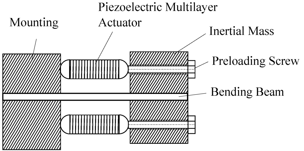 A thin beam is clamped between two steel blocks, which form the mounting of the inertial mass actuator. The width of the beam is large compared to its length to prevent torsion. The hole pattern of the mounting is suited for a connection to a shaker or a heavy breadboard. On the other side of the beam, the inertial mass is attached. It consists of an equal number of steel blocks on each side of the beam, which can be changed easily for experiments. The mass can be moved on the beam via slotted holes, which is necessary for the assembling of the piezoelectric actuators. These are monolithic multilayer actuators by CeramTec with a base area of × and a length of . On both sides of the piezoelectric actuators, spherical ceramic caps are glued to reduce damaging shear forces. To ensure the force transmission of the actuators and to avoid loosening and, therefore, the non-linear behavior, the actuators have to be pre-loaded. This is done by screws in the two masses next to the beam with a distance of to the beam’s surface. The tips of the pre-loading screws are concave as counterparts of the actuator’s ceramic caps. There are corresponding holes at the mounting at the same distance from the beam. This prevents shifting of the piezoelectric actuators in operation.