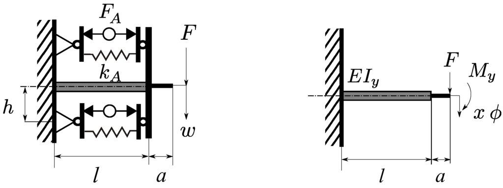 For the investigation, generic piezoelectric actuators are assumed, which are described by their longitudinal stiffness and block force . Both actuators are coupled to the tip of the beam by a lever of length h with respect to the neutral axis of the beam. The beam itself is characterized by its length l, Young’s modulus E and the moment of inertia . Since the actuators are coupled mechanically by spherical end caps, only normal forces are assumed to be transmitted at the mounting points of the actuators. External loads F and M are considered in order to couple the beam to other sub-systems, e.g., the tip mass.